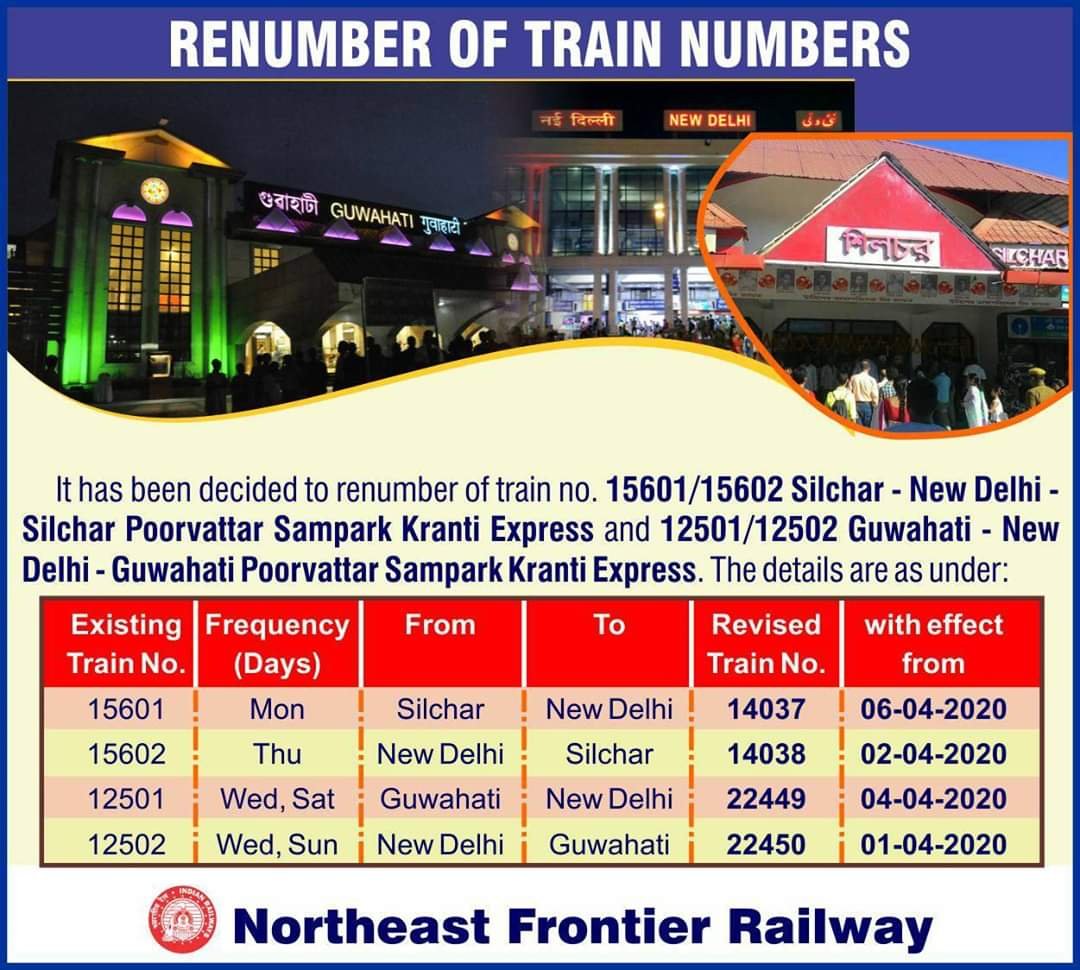 15601 /15602 नई दिल्ली सिल्चर नई दिल्ली पूर्वोत्तर संपर्क क्रांति एवं 12501 / 12502 नई दिल्ली गुवाहाटी नई दिल्ली पूर्वोत्तर संपर्क क्रांति एक्सप्रेस 01 अप्रेल 2020 से नए नम्बरोंके साथ चलाई जाएगी। अग्रिम आरक्षण करनेवाले यात्रीगण कृपया इस बात को नोट करें।
