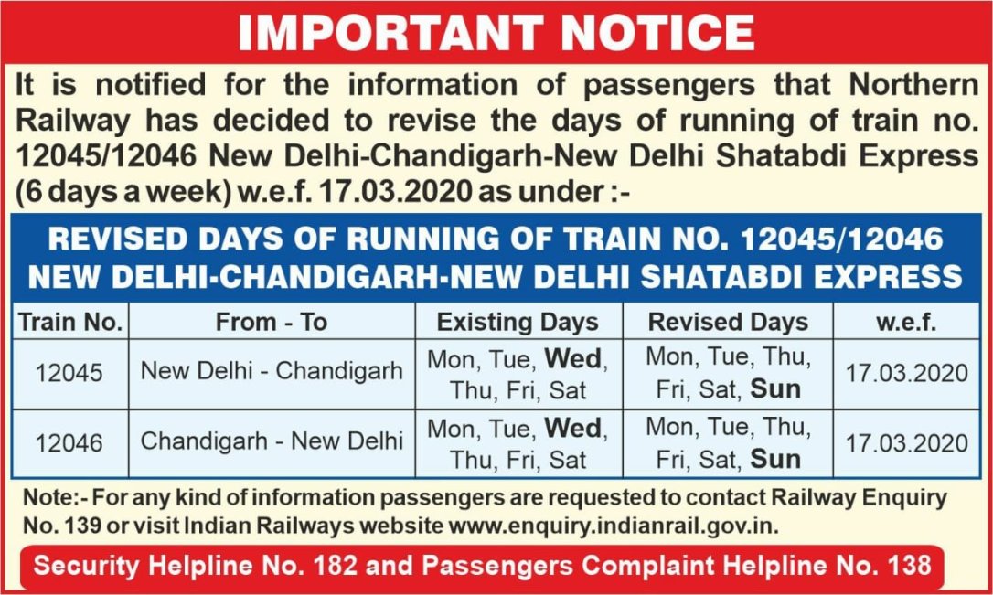 12045 / 12046 नई दिल्ली चंडीगढ़ नई दिल्ली शताब्दी एक्सप्रेस जो हफ्ते में छह दिन चलती है है, उसके सेवाओंके दिन में मार्च 2020 से तब्दीलियां की जा रही है। यात्रीगण कृपया इस बात को नोट करें।