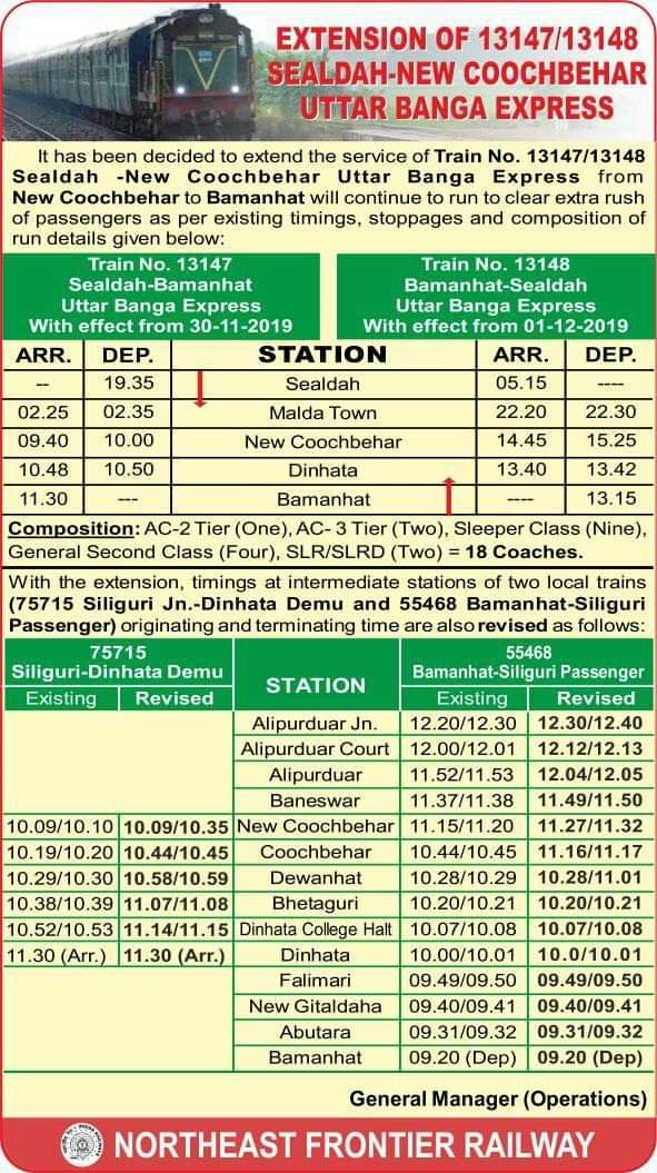 आज 13147 / 13148 सियालदाह न्यु कूचबिहार सियालदाह उत्तर बंग एक्सप्रेस का बामनहाट स्टेशन तक विस्तार किया गया। उसी की कुछ तस्वीरें और समयसारिणी।