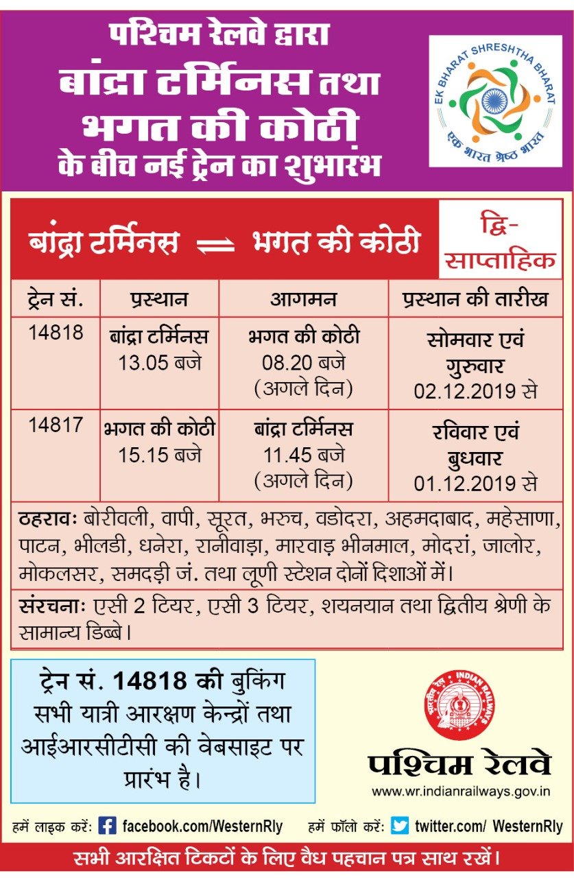 चलो, आ जाते अपने आज में। एक नई गाड़ी 14817 / 14818 बांद्रा भगत की कोठी एक्सप्रेस वाया भीलड़ी, समदड़ी होकर चलने लगी है।