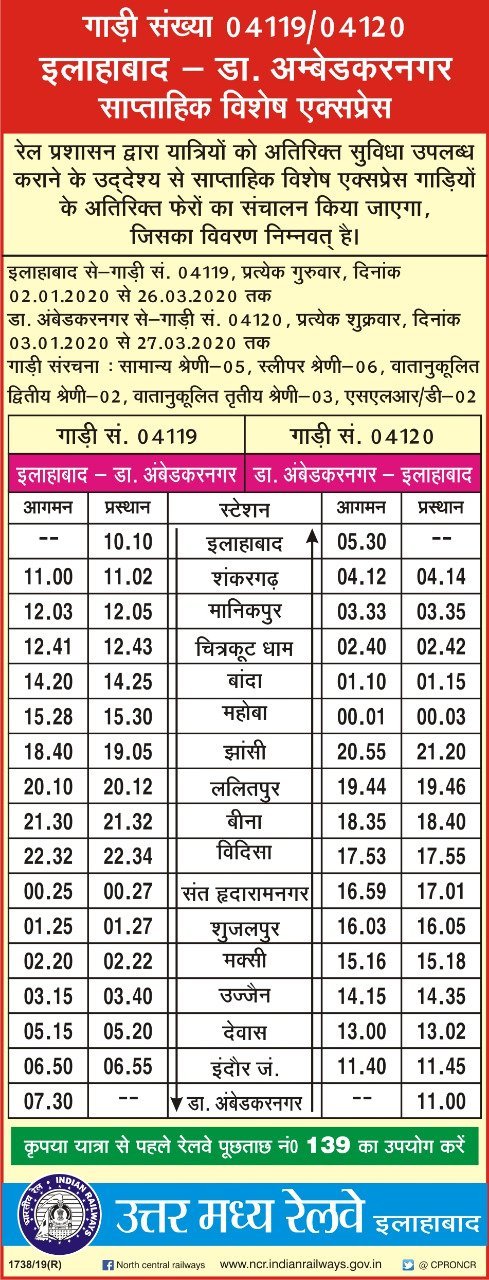 Uncategorisedउत्तर मध्य रेल्वे की विशेष गाड़ियाँ 3rd Dec 20193rd Dec 2019 Rail Duniya उत्तर मध्य रेल्वे ने झांसी बांद्रा टर्मिनस और ड़ॉ अम्बेडकर नगर महू प्रयागराज के बीच विशेष गाड़ियाँ चलाने की घोषणा की है। Share this: Share on WhatsApp (Opens in new window) WhatsApp Share on X (Opens in new window) X Share on Facebook (Opens in new window) Facebook Share on Telegram (Opens in new window) Telegram Email a link to a friend (Opens in new window) Email Like Loading... Related Published by Rail Duniya Rail Duniya is a magazine publishing all India train timings since 1988. View all posts by Rail Duniya