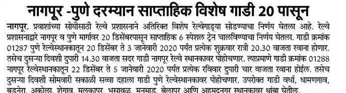 01287 पुणे नागपुर विशेष गाड़ी दिनांक 20 दिसम्बर से 03 जनवरी तक हर शुक्रवार को रात 20.30 को पुणे से नागपुर के लिए चलेगी और दूसरे दिन याने शनिवार को दोपहर 14.30 को नागपुर पोहोंचेगी।