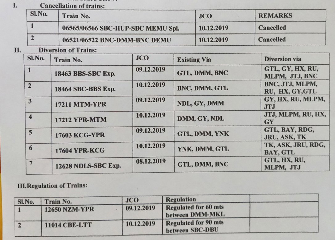 12650 हजरत निजामुद्दीन बंगालुरु संपर्क क्रांति एक्सप्रेस JCO 09 दिसम्बर और 11014 कोयम्बटूर लोकमान्य तिलक टर्मिनस एक्सप्रेस JCO 10 दिसम्बर दोनों गाड़ियाँ, अपने सफर में करीबन 60 मिनट रेग्युलेट याने कम ज्यादा देरीसे चलाई जाएगी।