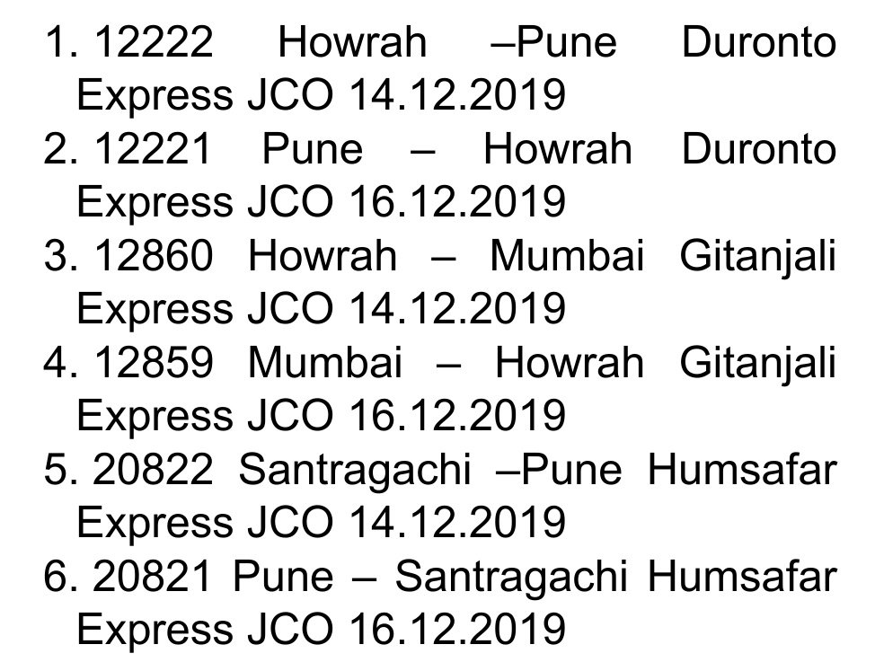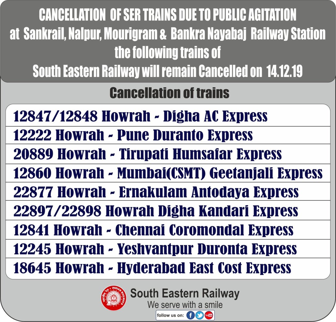 मध्य रेलवे ने परिपत्रक जारी किया है। हावड़ा खड़गपुर मार्ग में अवरोध की वजह से निम्नलिखित 3 जोड़ी गाड़ियाँ रद्द रहेंगी।
