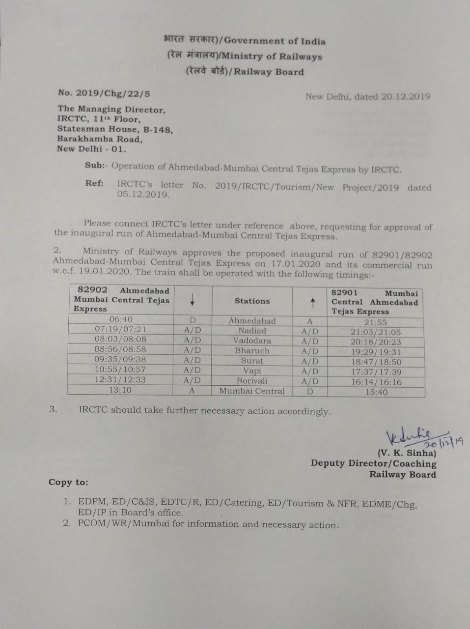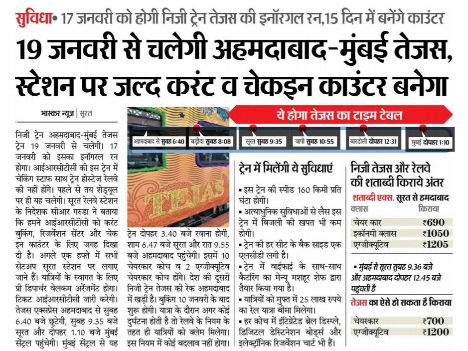देश की दूसरी प्राइवेट तेजस एक्सप्रेस जो की मुम्बई अहमदाबाद के बीच चलाई जाने वाली है, उसका टाइमटेबल रेल्वे बोर्ड से मंजूर हो चुका है।