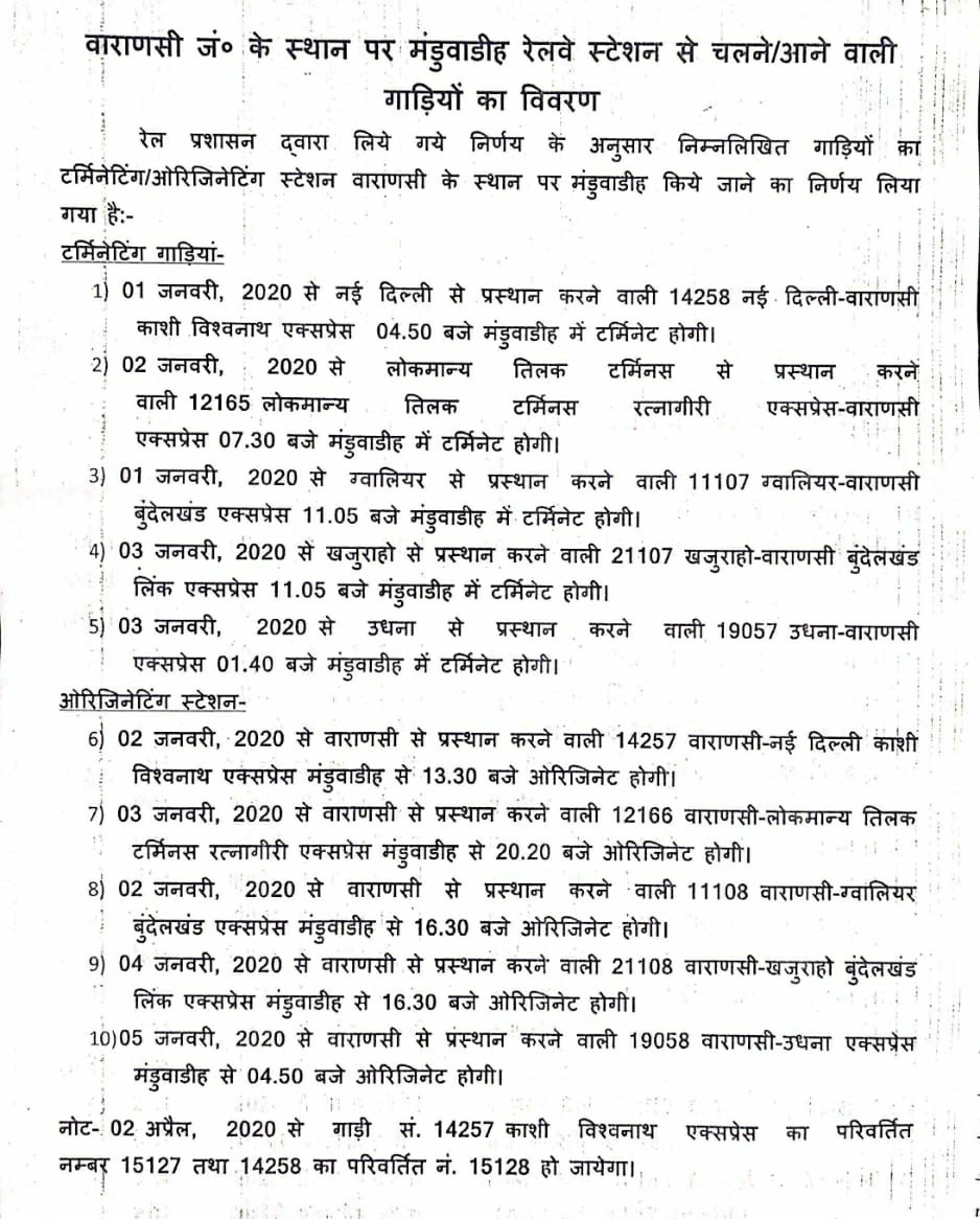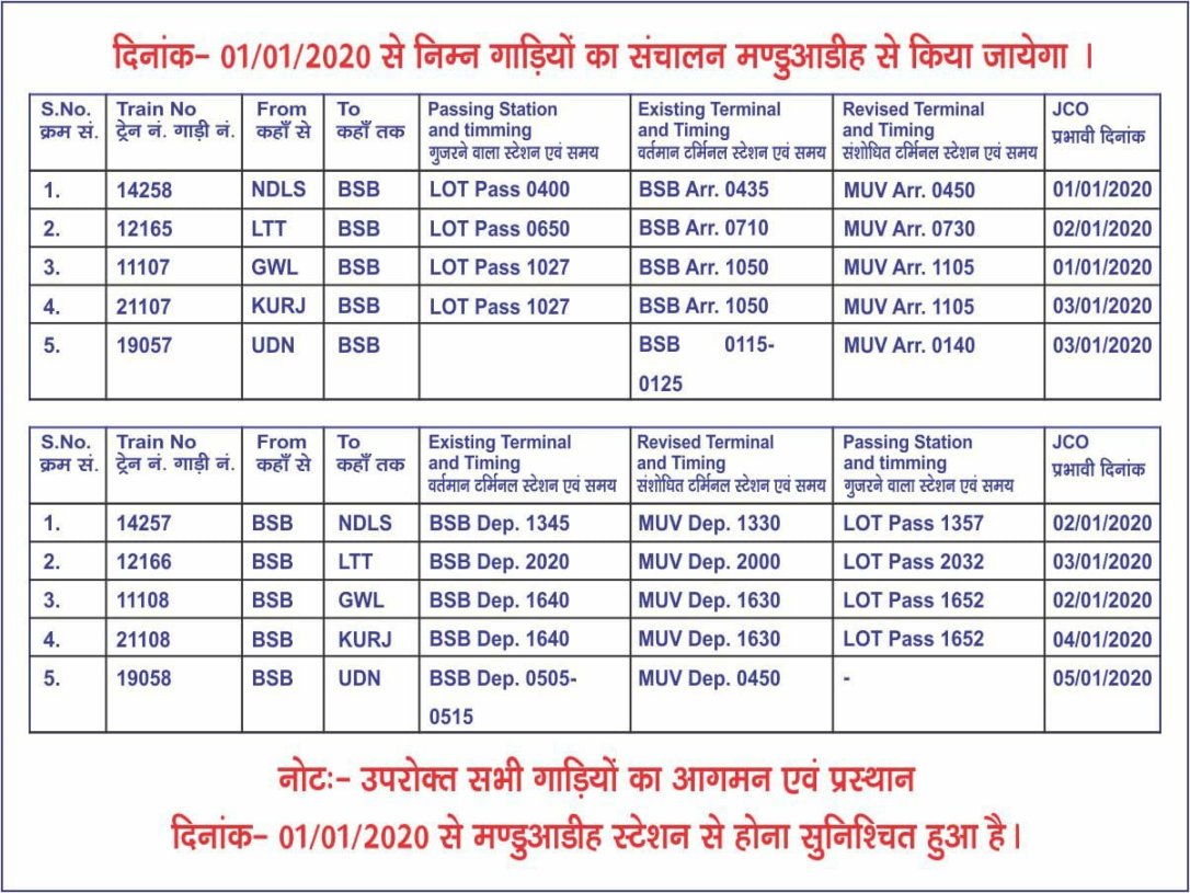 निम्नलिखित पांच जोड़ी गाड़ियाँ 1 जनवरीसे वाराणसी जंक्शन के जगह मंडुआडीह से चलेगी और लौटने में वाराणसी में खत्म होने की जगह मंडुआडीह तक जाएगी।