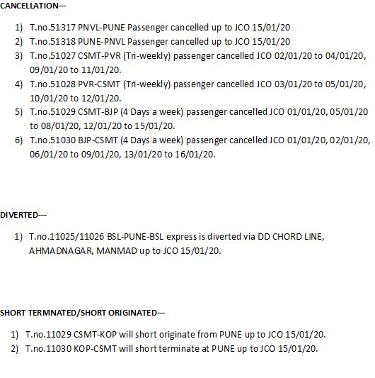 मुम्बईसे पुणे होकर पंढरपुर, विजयपुरा जानेवाली पैसेंजर, पुणे पनवेल पैसेंजर यह गाड़ियाँ रद्द रहेंगी।