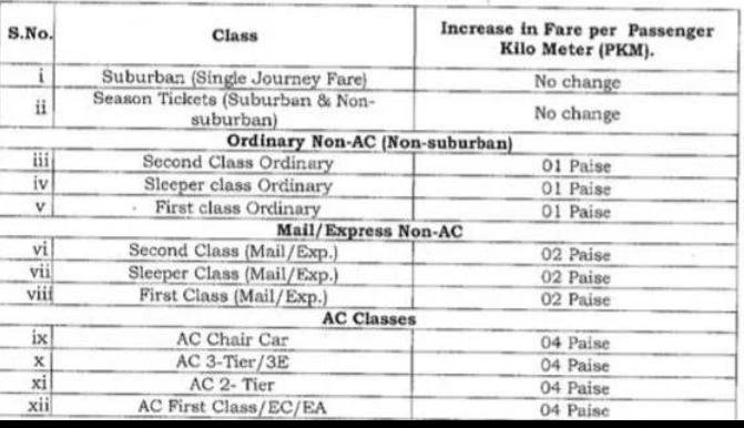 रेल मंत्रालय द्वारा निर्धारित किया गया है की दिनांक – 01.01.20 से यात्री किराए में निम्न प्रकार से बढ़ोतरी की गई है।