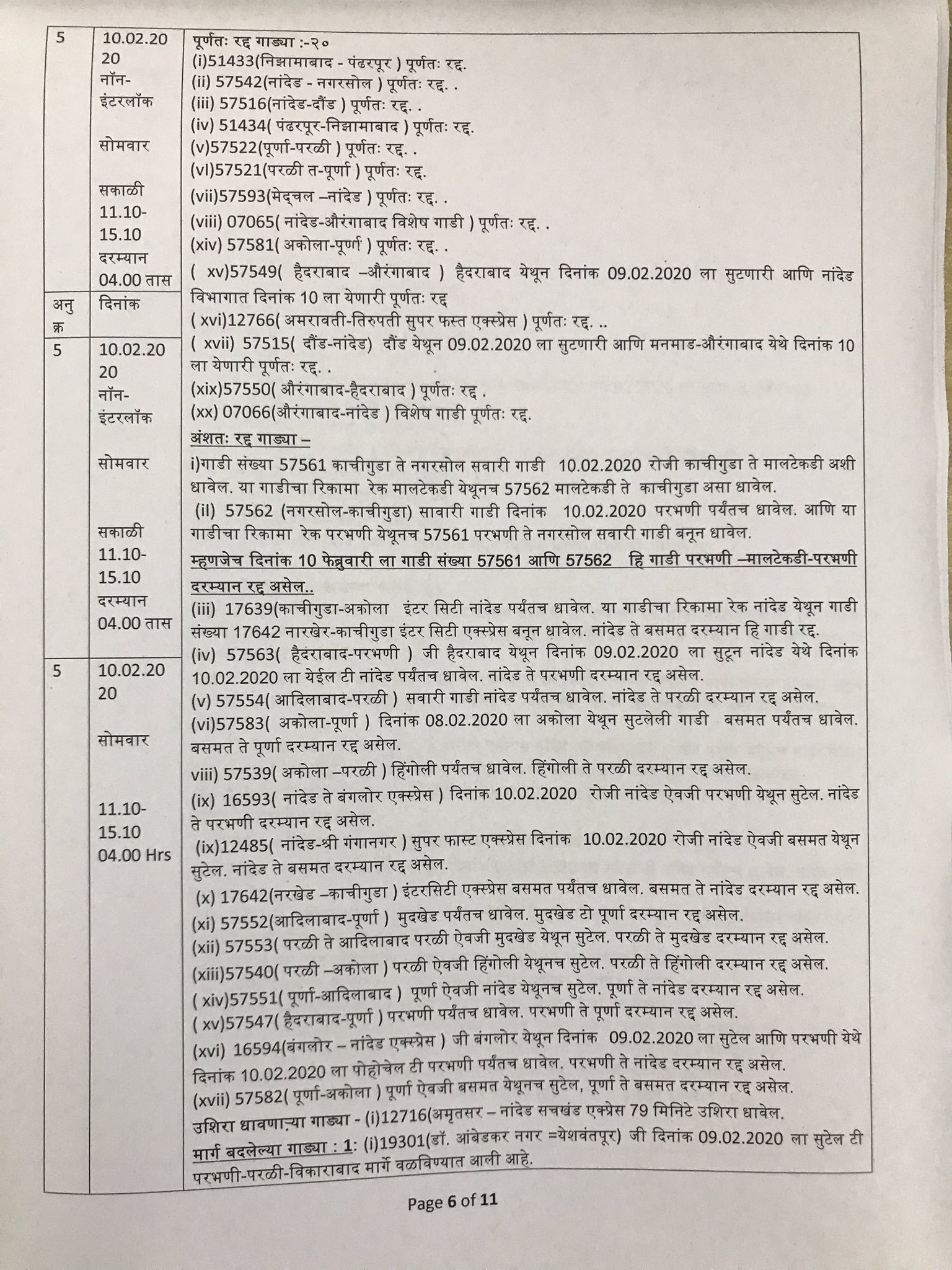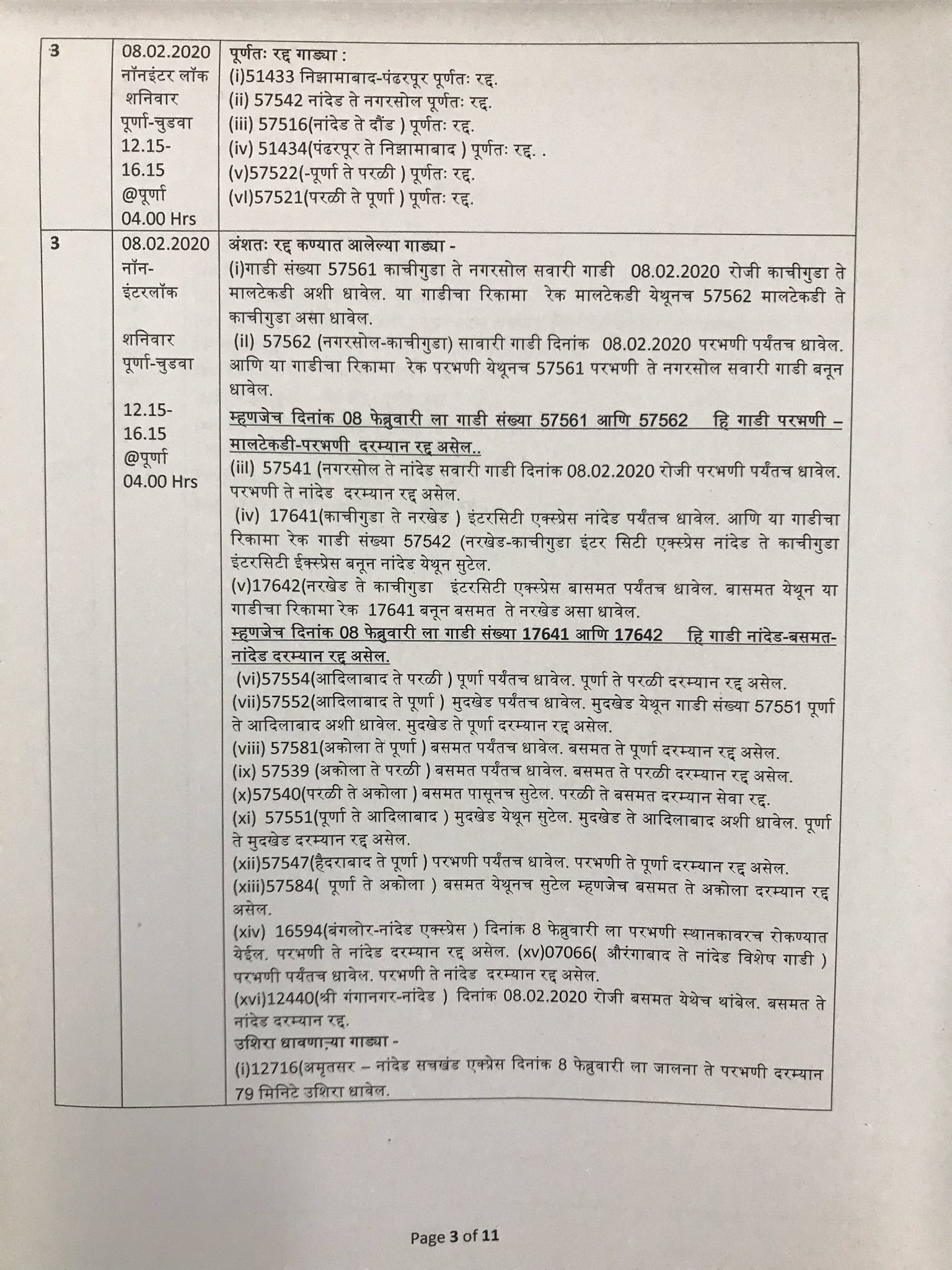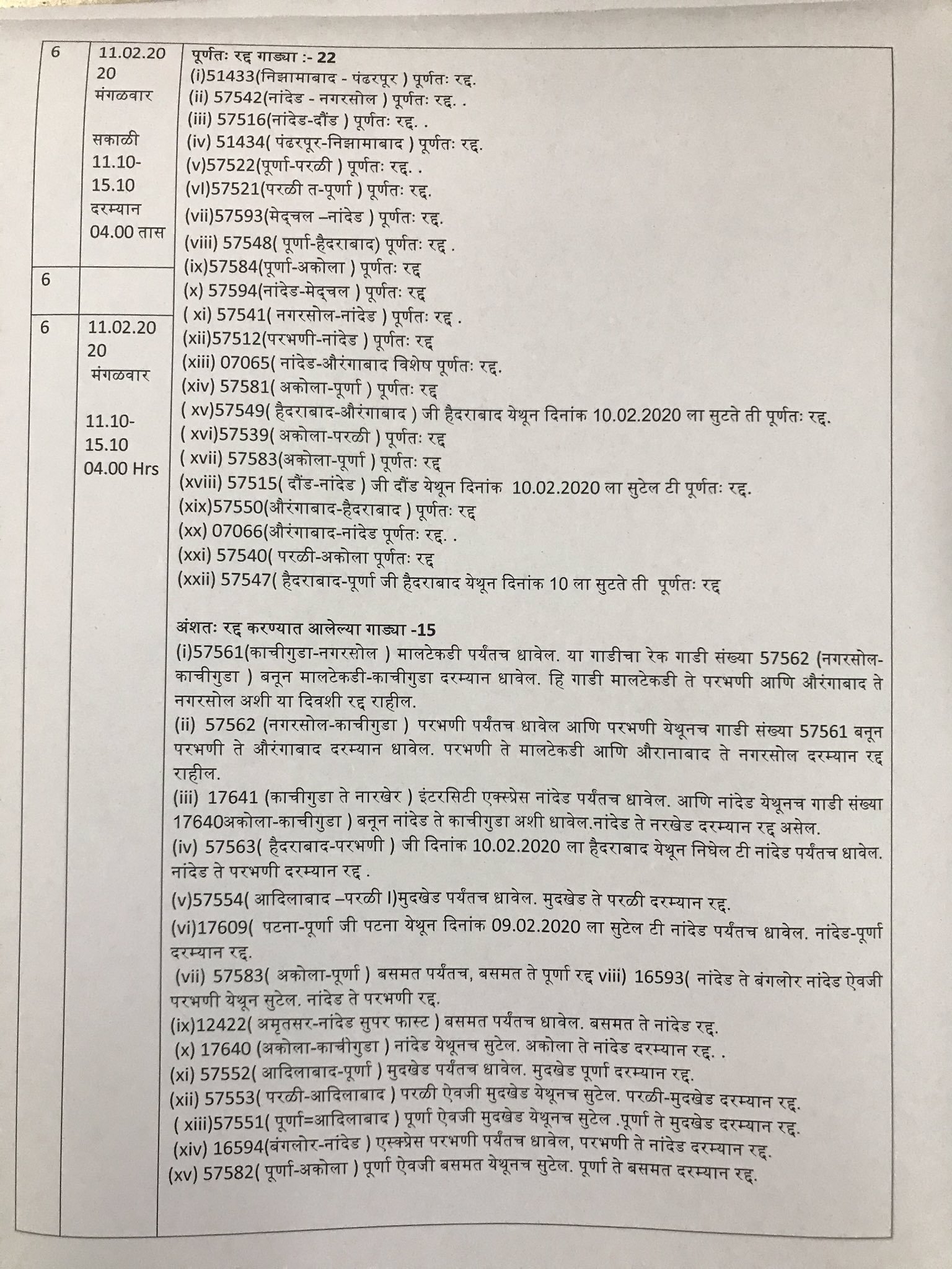 परभणी-मुदखेड दुहेरीकरण और सिग्नलिंग के कार्य हेतु, साथ ही रेल लाइनोंको आपस मे लिंक कराने के लिए नौ दिन का रेल लाइन ब्लॉक लिया जा रहा है।