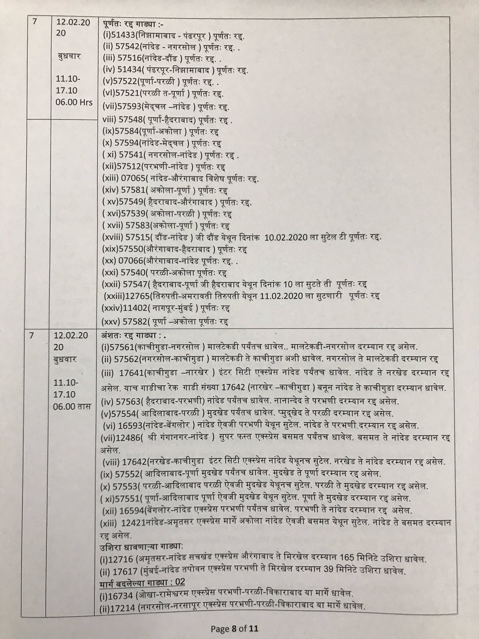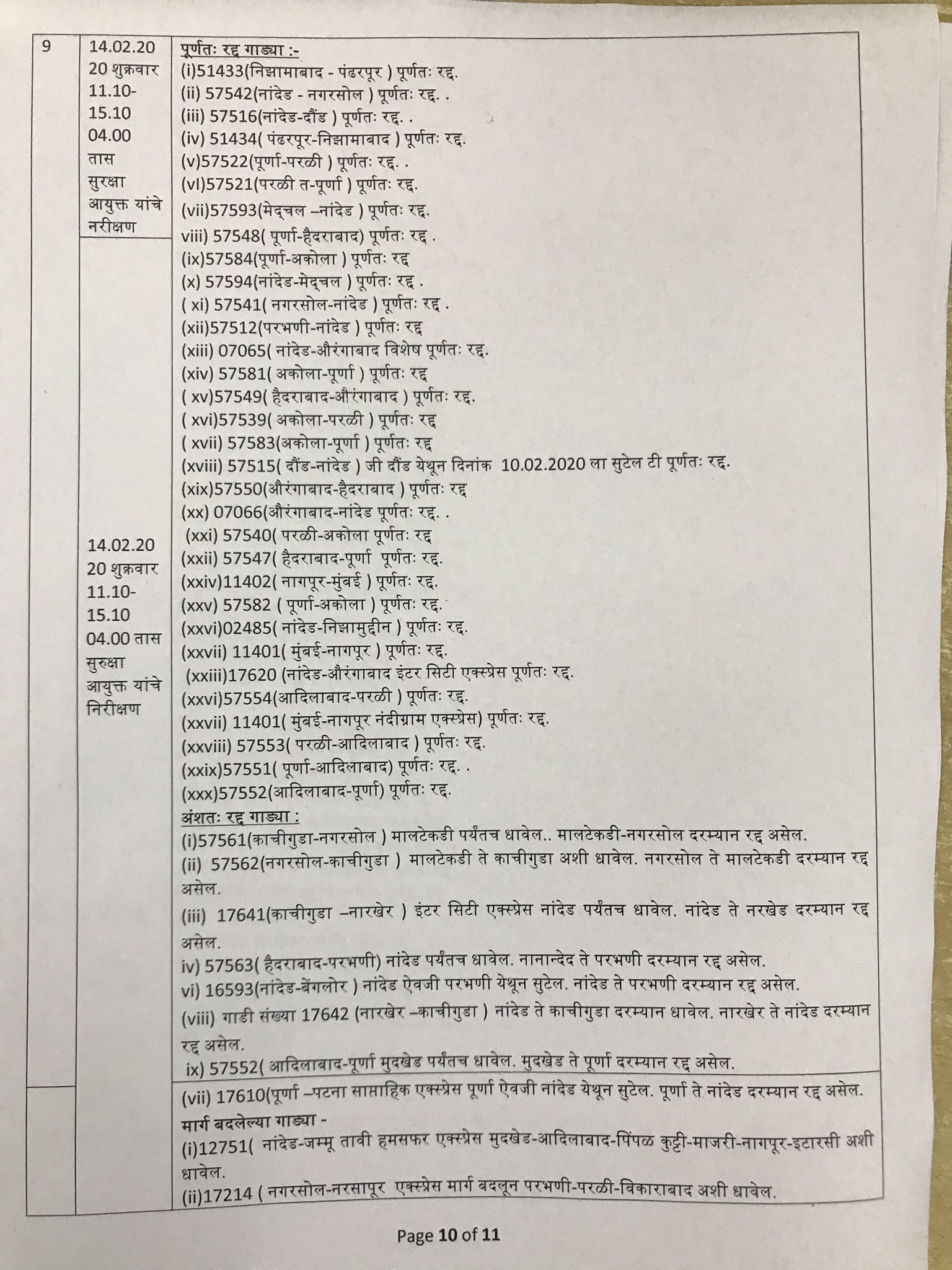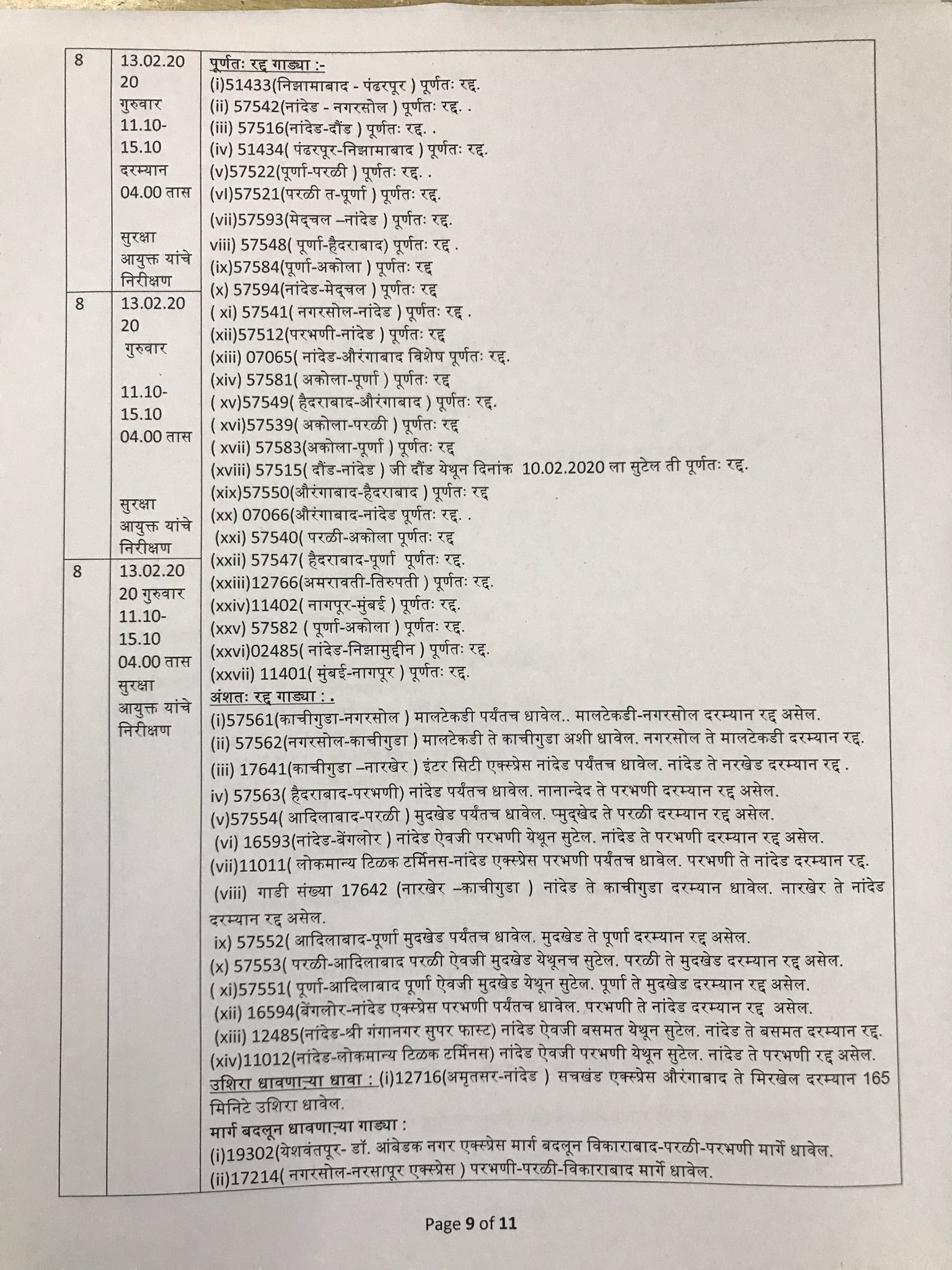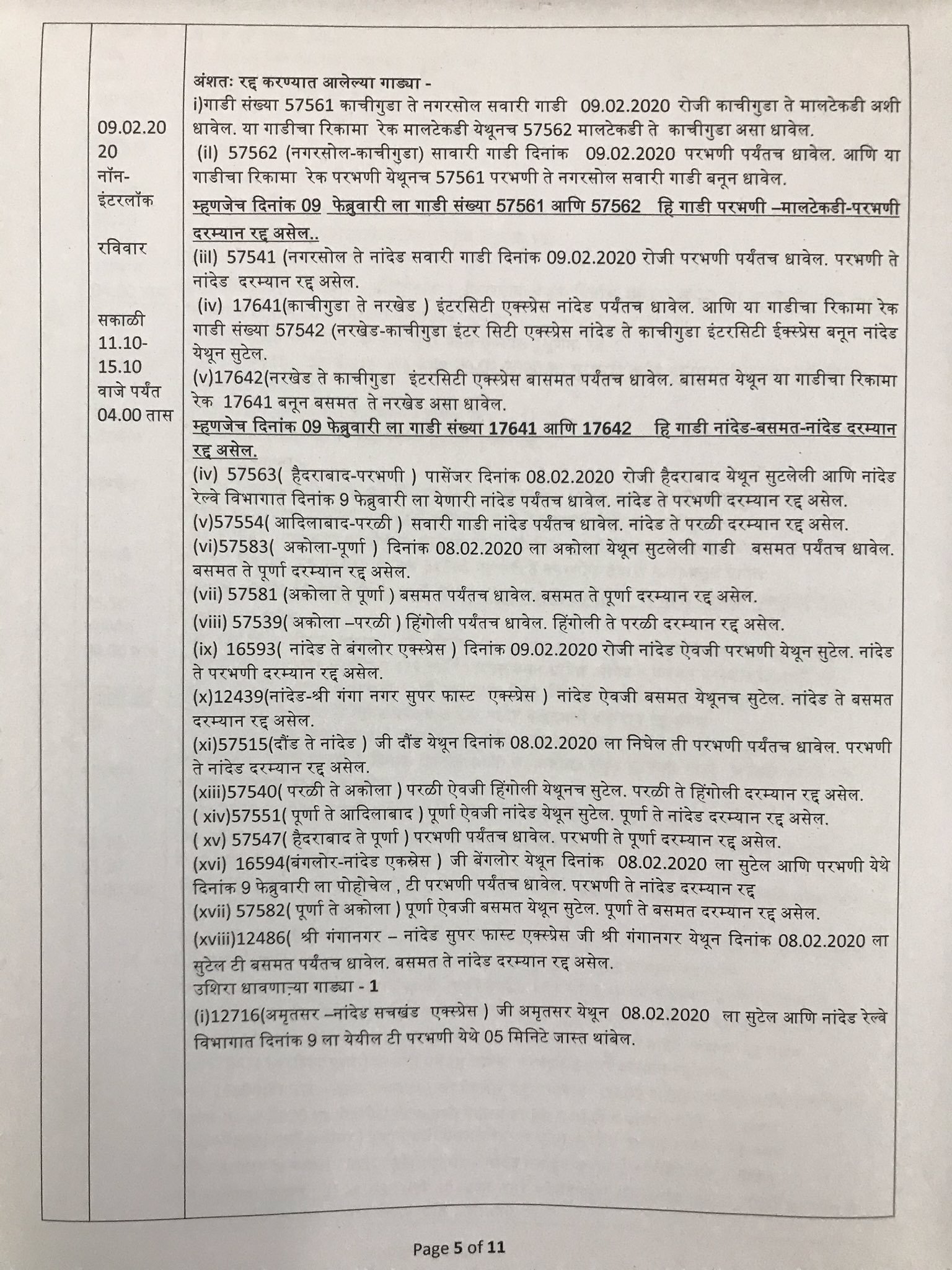 परभणी-मुदखेड दुहेरीकरण और सिग्नलिंग के कार्य हेतु, साथ ही रेल लाइनोंको आपस मे लिंक कराने के लिए नौ दिन का रेल लाइन ब्लॉक लिया जा रहा है।