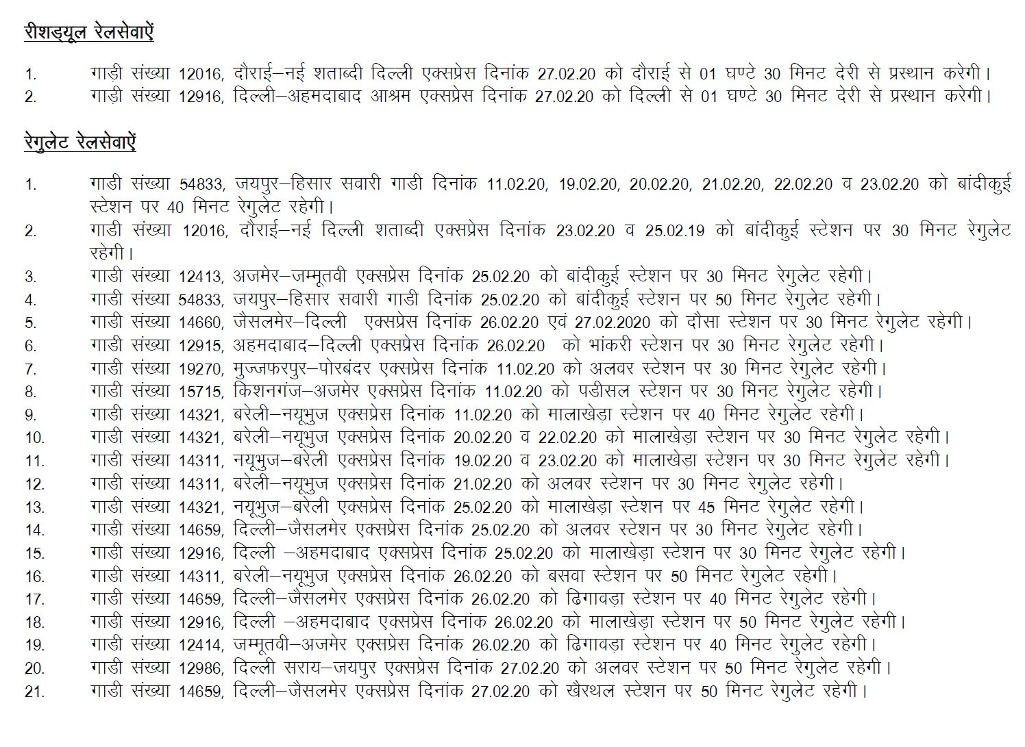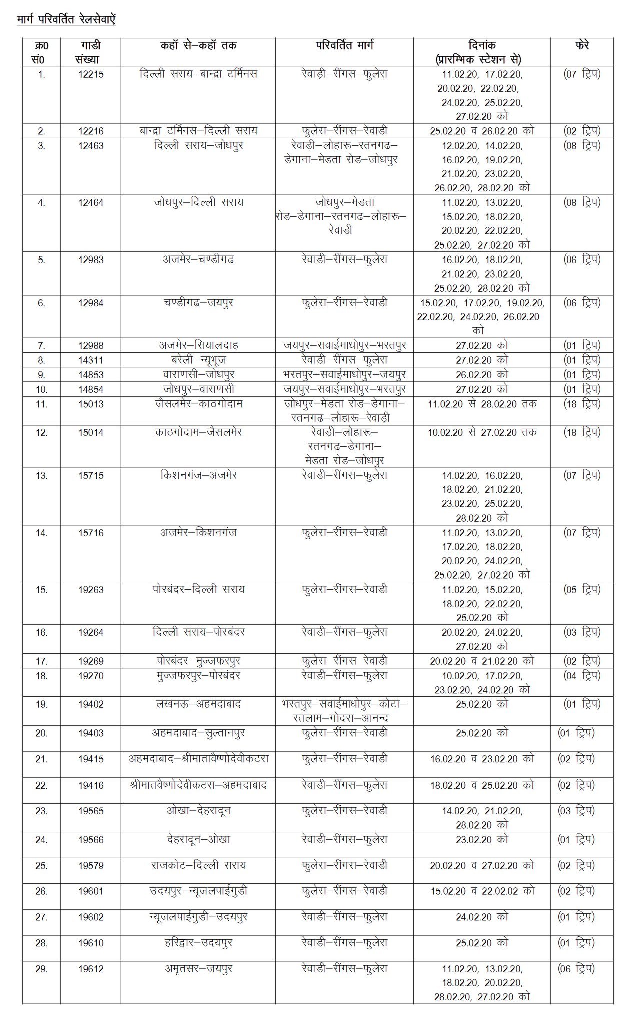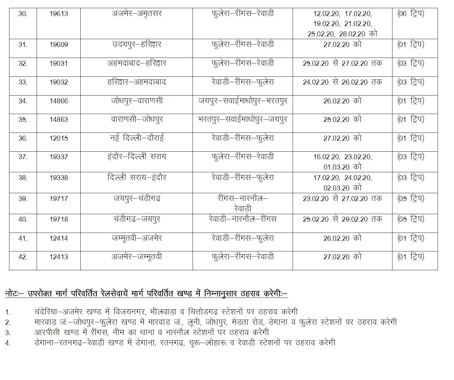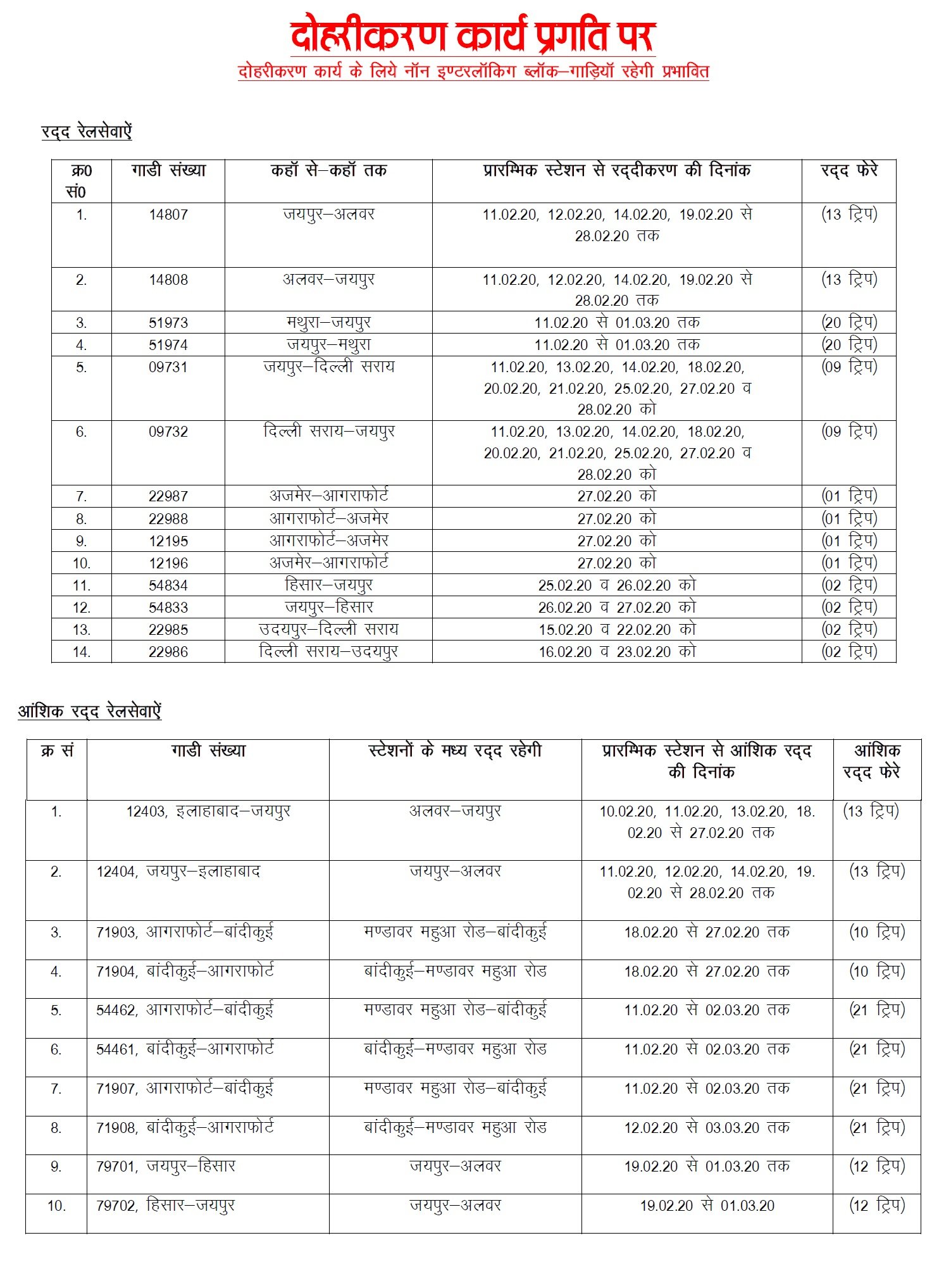 बांदीकुई-रेवाड़ी रेलखण्ड पर बांदीकुई-ढिगावड़ा स्टेशनों के मध्य दोहरीकरण कार्य के कारण दिनांक 11.02.20 से 27.02.20 तक रेलसेवायें रद्द/ आंशिक रद्द/रेगुलेट/रीशड्यूल/मार्ग परिवर्तित रहेगी।