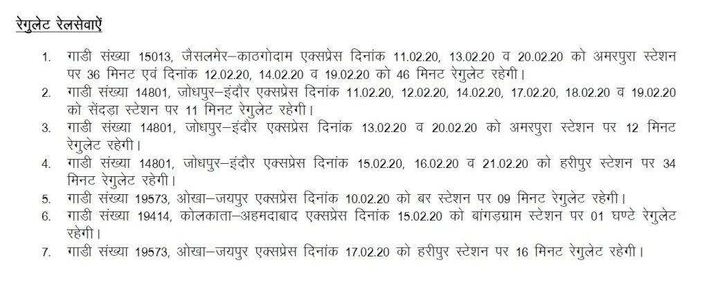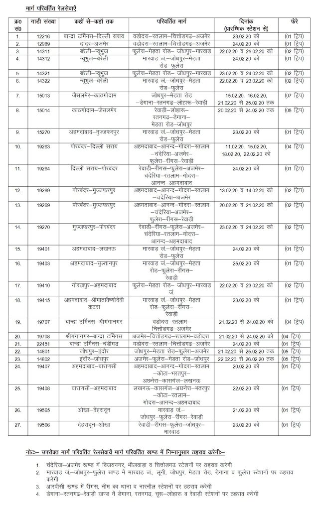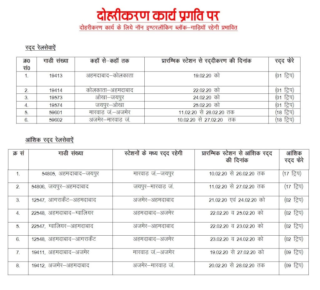 उत्तर पश्चिम रेलवे के अजमेर मण्डल में अजमेर – मारवाड़ रेलखण्ड पर दिनांक 11.02.20 से 25.02.20 तक बांगड़ग्राम – सेंदड़ा स्टेशनों के बीच रेल के दोहरीकरण के कार्य के चलते निम्नलिखित रेलसेवायें रद्द / आंशिक रद्द / रेगुलेट / मार्ग परिवर्तित रहेगी।