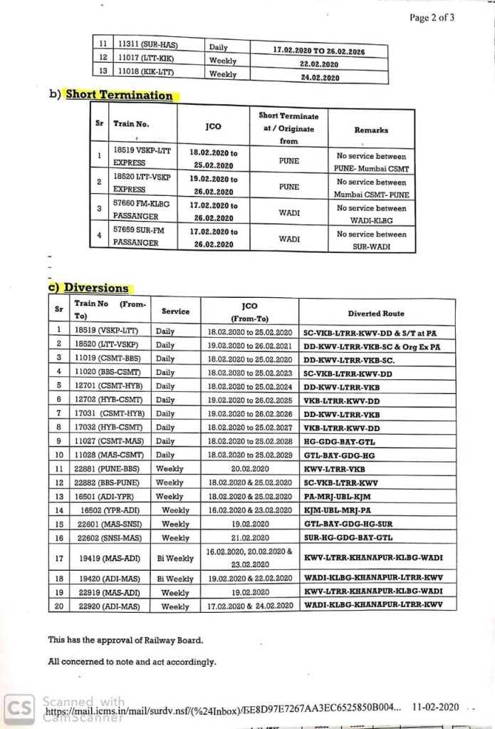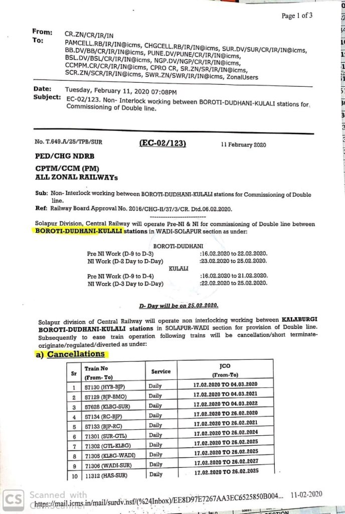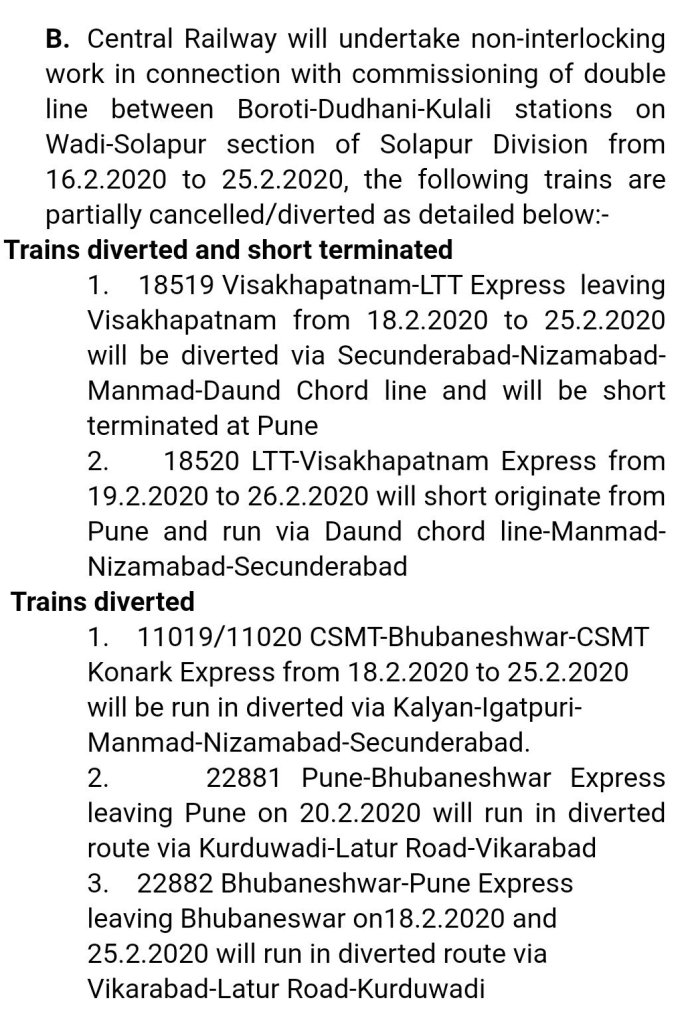मध्य रेलवे के सोलापुर मण्डल में, कलबुर्गी – बोरोटी – दुधनी – कूलाली इन स्टेशनोके बीच रेल लाइन डबलिंग का कार्य शुरू है। इस कार्य के चलते कुछ गाड़ियाँ दिनांक 16 फरवरी से 26 फरवरी तक रद्द / आंशिक रद्द / परावर्तित मार्ग पर चलाई जाने वाली है।