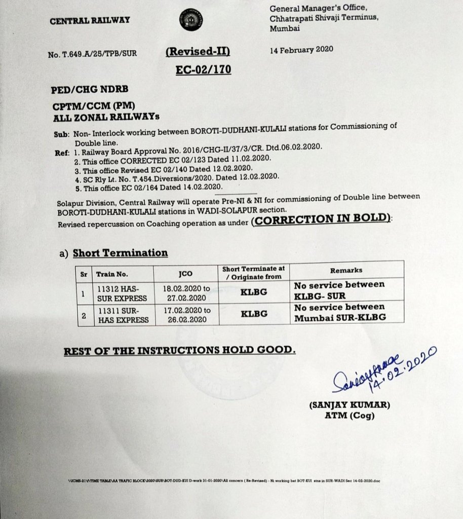एक नई सुधारणा भी है – 11311 / 11312 हसन सोलापुर हसन एक्सप्रेस ब्लॉक के दिनोंमें हसन- कलबुर्गी के बीच चलेगी, और कलबुर्गी – सोलापुर के बीच रद्द रहेगी। ज्ञात रहे ब्लॉक के दौरान यह गाड़ी दिनांक 16 से 26 फरवरी तक रद्द रहनेवाली थी।