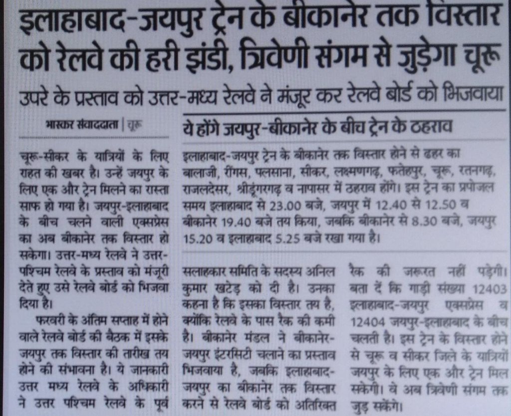 बीकानेर को इलाहाबाद से डायरेक्ट कनेक्टिविटी मिल रही है। इलाहाबाद जयपुर एक्सप्रेस को रतनगढ़ चूरू होकर बीकानेर तक विस्तार कराने की मंजूरी मिल गयी है।