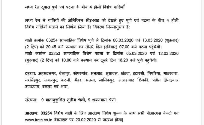मध्य रेल द्वारा पुणे एवं पटना के बीच 4 और कोंकण रेलवे पर होली विशेष गाडियाँ शुरू की जा रही है।