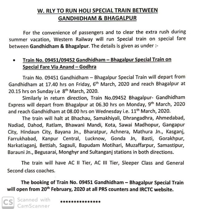 पश्चिम रेल्वे की गांधीधाम भागलपुर गांधीधाम स्पेशल्स