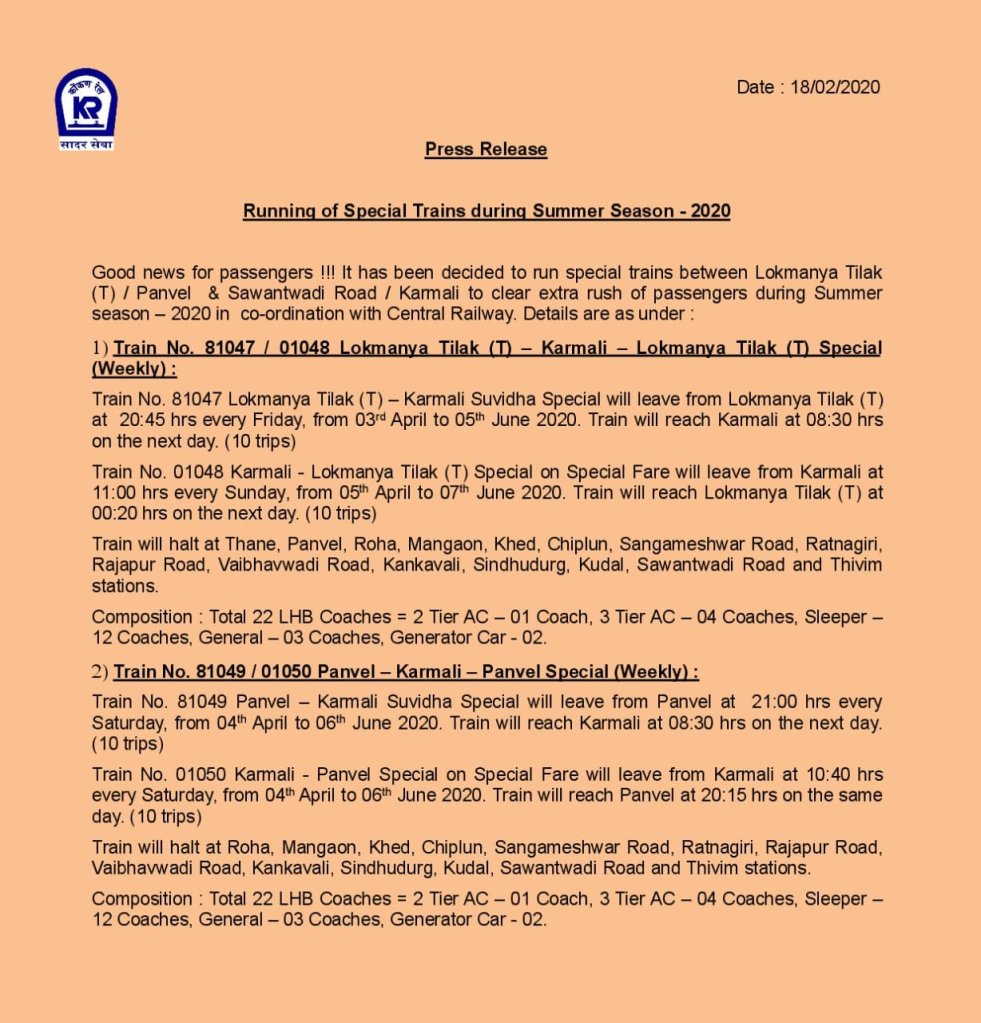 मध्य रेलवे से कोंकण रेलवे की ओर होली स्पेशल गाड़ियाँ