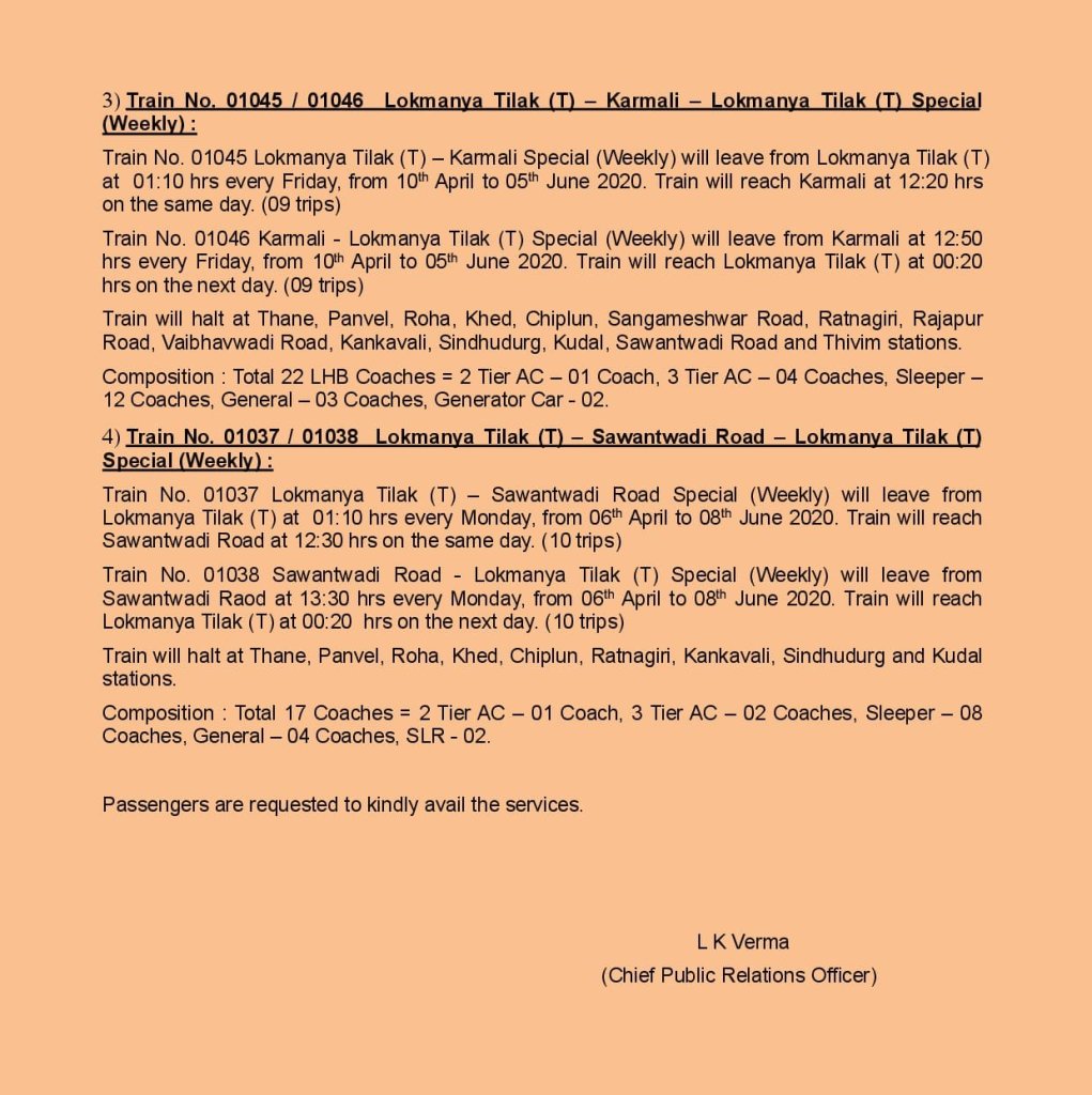 03254 विशेष पुणे से दि 06.03.2020 एवं 13.03.2020 को 20.45 बजे प्रस्थान होगा।
