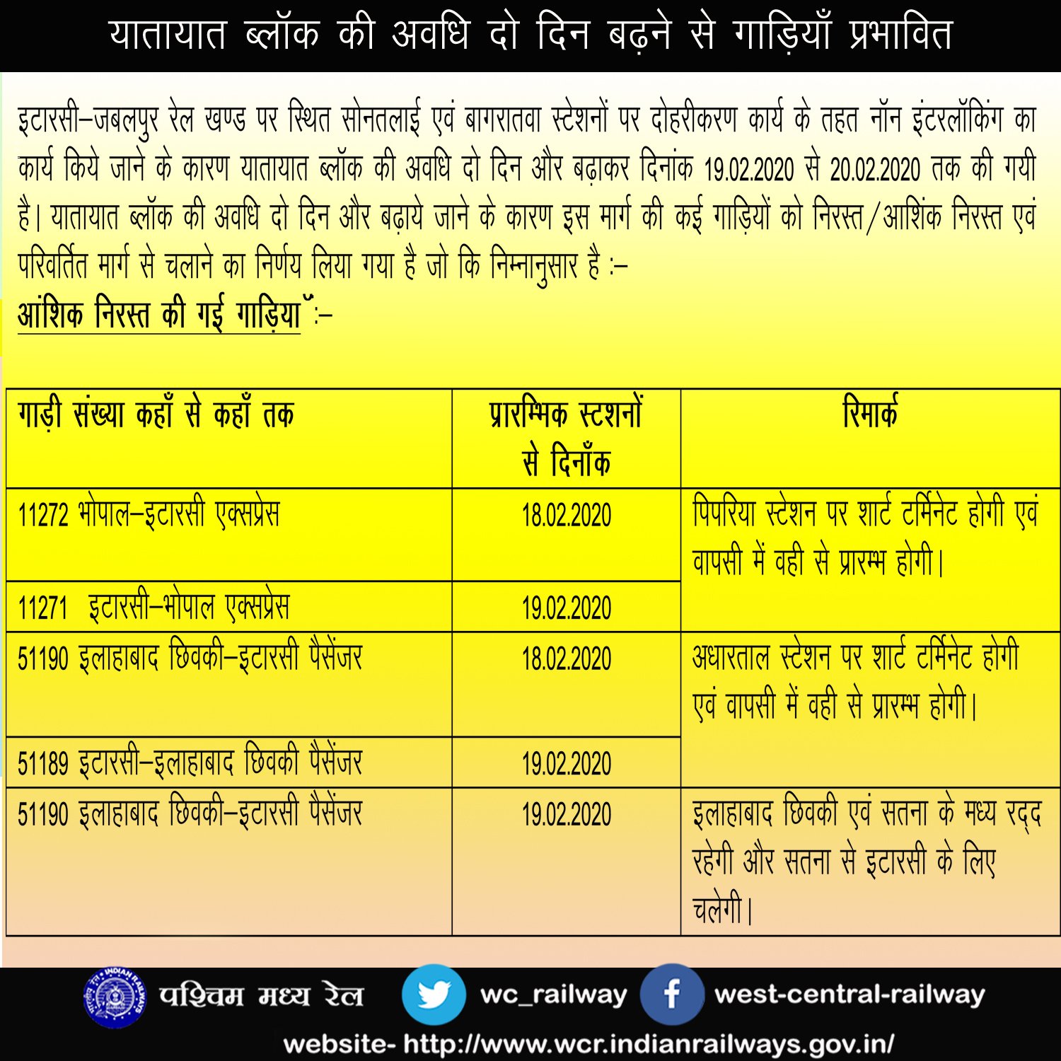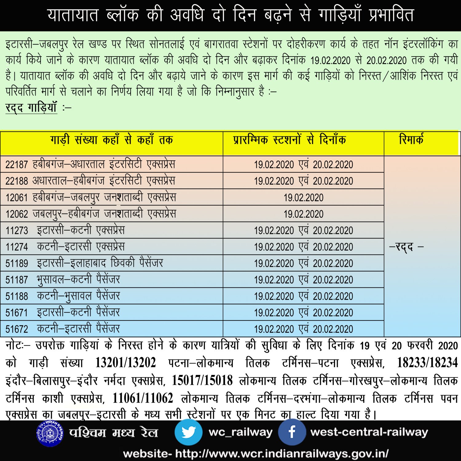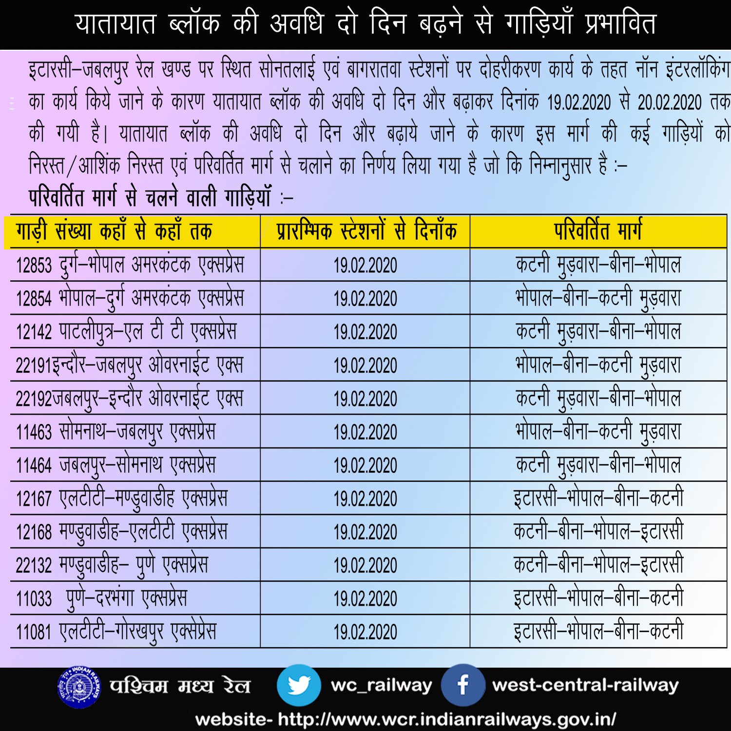 इटारसी – जबलपुर रेल मार्ग पर सोनतलाई बाघरातवा रेल लाइन का दोहरीकरण कार्य दिनांक 17 से शुरू है इसके लिए दिनांक 17 एवं 18 को रेल ब्लॉक लिया गया था, लेकिन काम पूरा न होने की वजह से अवधी बढ़ा कर 19 और 20 फरवरी तक यह रेल ब्लॉक जारी रहेगा। कृपया बाधित गाड़ियोंकी सूचना देख, अपनी यात्रा का नियोजन करे।