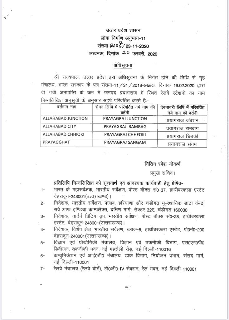भारत व उत्तर प्रदेश सरकार ने प्रयागराज जनपद में स्थित इलाहाबाद जंक्शन, इलाहाबाद सिटी, इलाहाबाद छिवकी, व प्रयागघाट स्टेशनों के नाम को प्रयागराज से प्रारम्भ होने वाले शब्दों पर रखने का निर्णय लिया है।