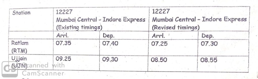 12227 मुम्बई इंदौर दुरंतो एक्सप्रेस के रतलाम और उज्जैन के समय अब पुराने समय से पहले हो गए है। कृपया निम्नलिखित परिपत्रक देखे।