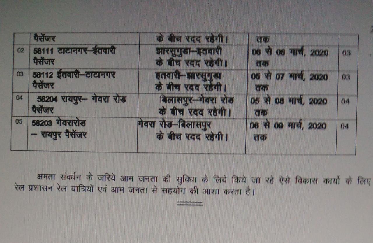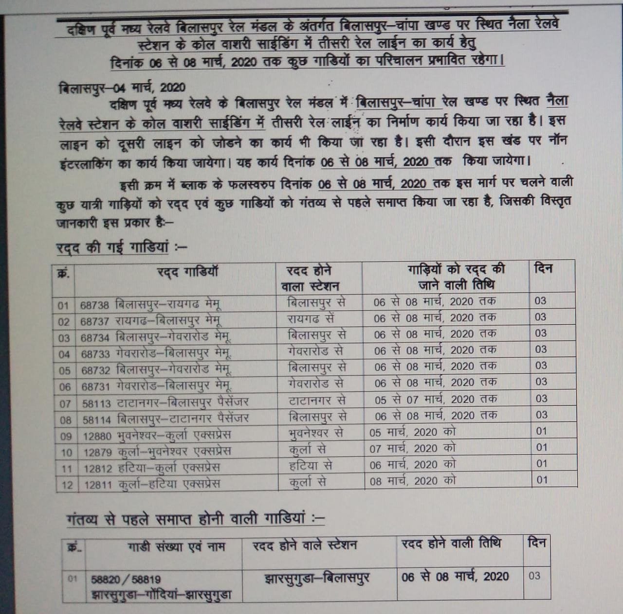 बिलासपुर चाम्पा के बीच तीसरी लाइन के कार्य हेतु दिनांक 06 मार्च से 08 मार्च तक कई गाड़ियाँ रद्द / रेग्युलेट रहने वाली है। कृपया बिलासपुर क्षेत्रीय रेलवे से जारी हुवा परिपत्रक देखे।