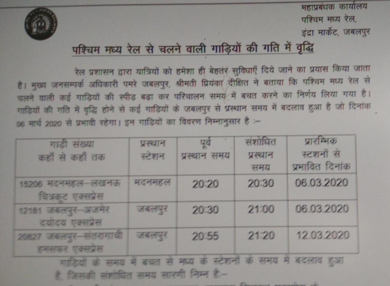 पश्चिम मध्य रेलवे की 06 मार्च से 3 गाड़ियोंको स्पीड अप किया गया है। 15206 मदनमहाल लखनऊ चित्रकूट एक्सप्रेस, 12181 जबलपुर अजमेर दयोदय एक्सप्रेस, 20827 जबलपुर सांतरागाछी हमसफ़र एक्सप्रेस यह वे तीन गाड़ियाँ है।