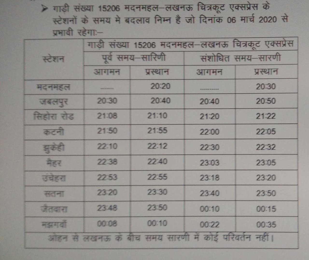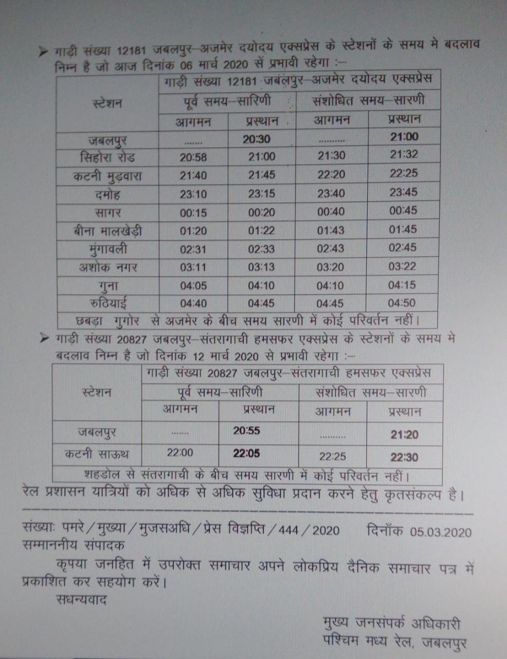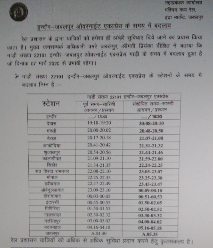 22191 इन्दौर जबलपुर ओवरनाइट एक्सप्रेस के समयसारणी में 07 मार्च से बदलाव किया गया है।