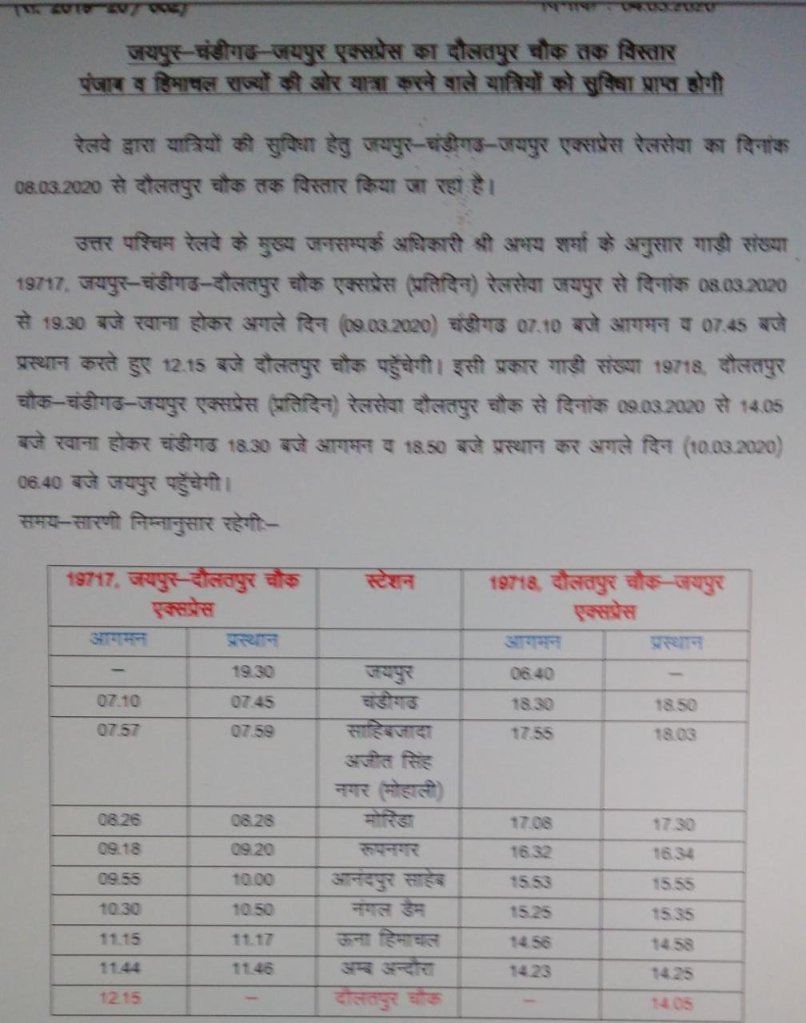 19717/19718 जयपुर चंडीगढ़ जयपुर एक्सप्रेस दिनांक 08/09 मार्च से चंडीगढ़ से आगे दौलतपुर चौक तक विस्तरित की जा रही है। इस विस्तार से हिमाचल में जानेवाले पर्यटकों और सेना के जवानोंको काफी सुविधा होगी।