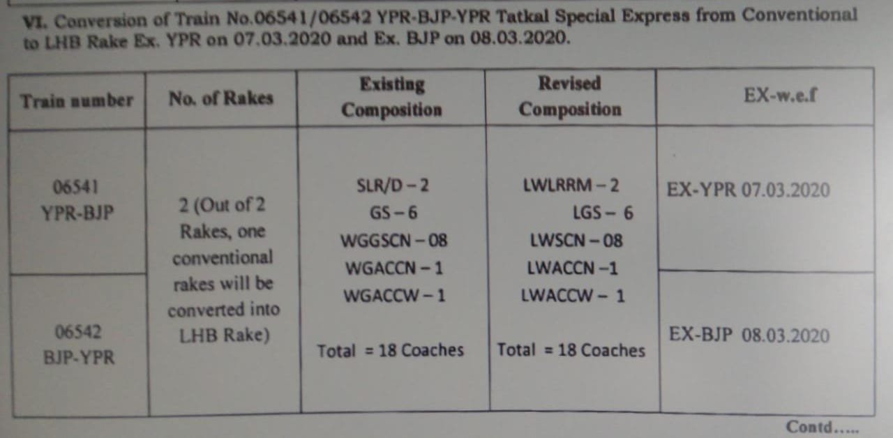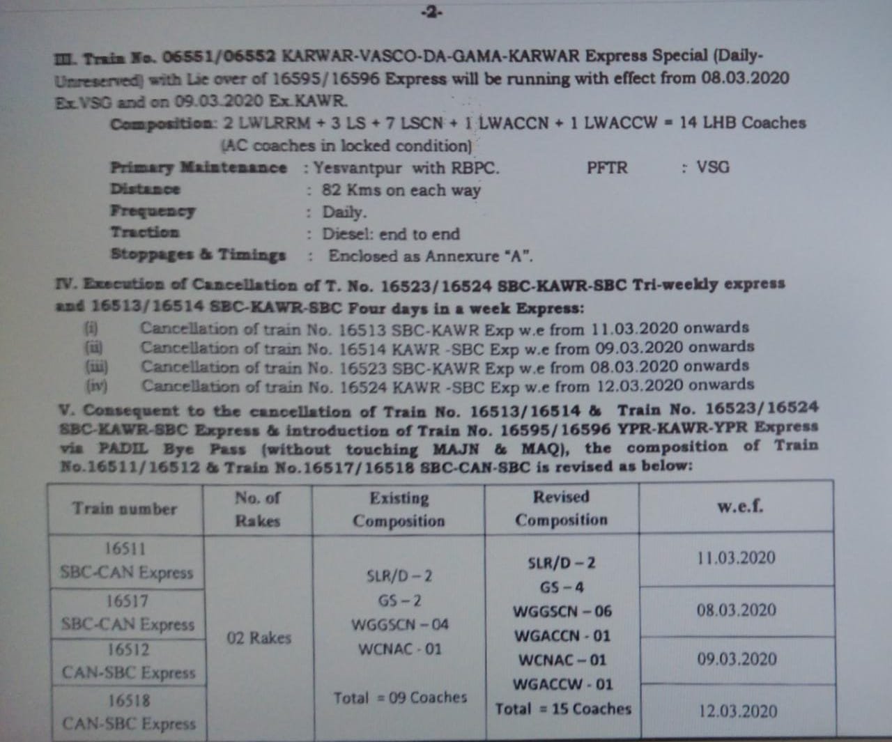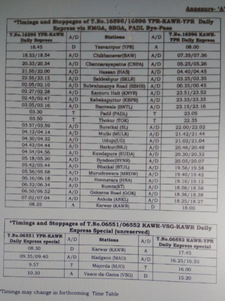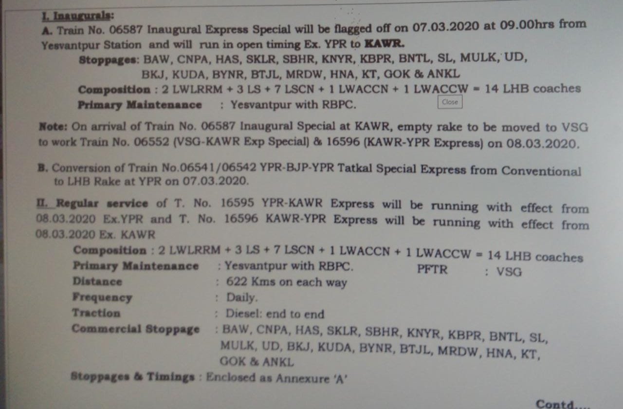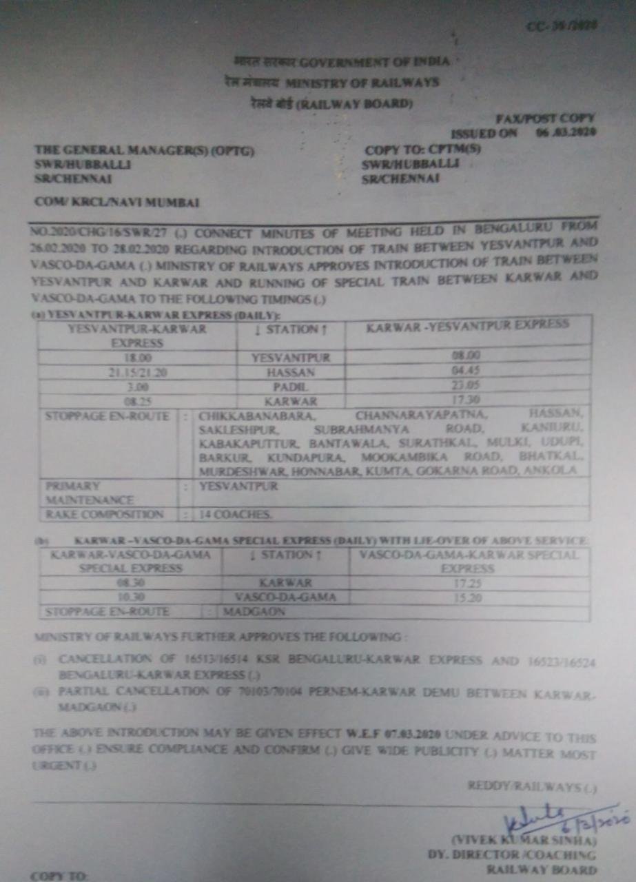दक्षिण पश्चिम रेलवे: 16513/16514 और 16523/16524 बंगालुरु कारवार एक्सप्रेस गाड़ियोंके परिचालन को रद्द कर 16595 / 16596 यशवंतपुर कारवार एक्सप्रेस और आगे कारवार वास्कोडिगामा के बीच इसी गाडीको 06551 / 06552 विशेष गाड़ी बनाकर चलाया जाएगा।