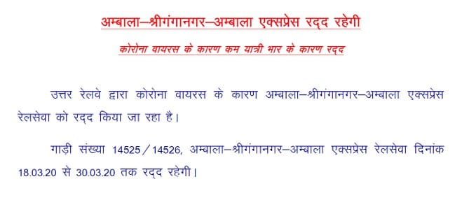 उत्तर रेलवे की 14525 / 14526 अम्बाला श्रीगंगानगर अम्बाला गाड़ी भी 31 मार्च तक पूर्णतया रद्द रहेगी।