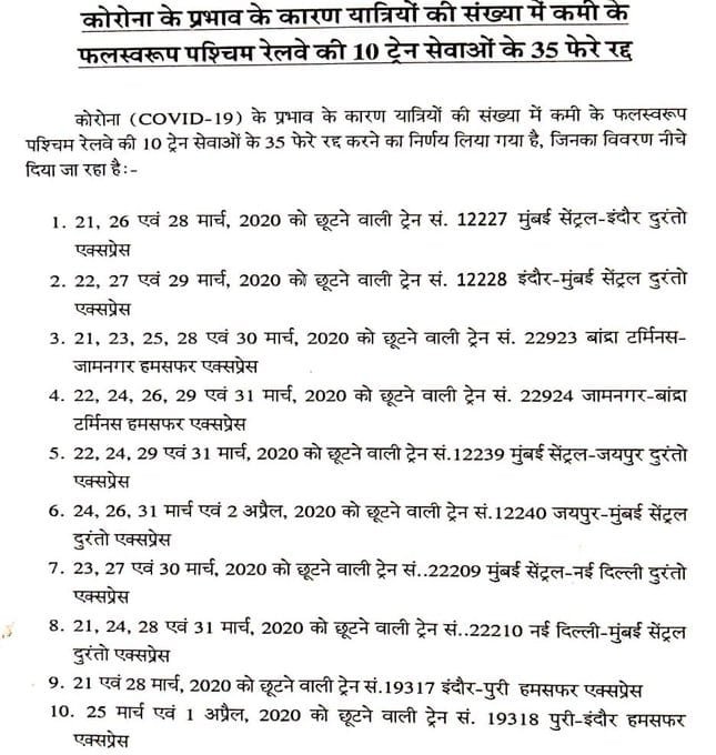 मध्य रेलवे की निम्नलिखित गाड़ियाँ रद्द है।