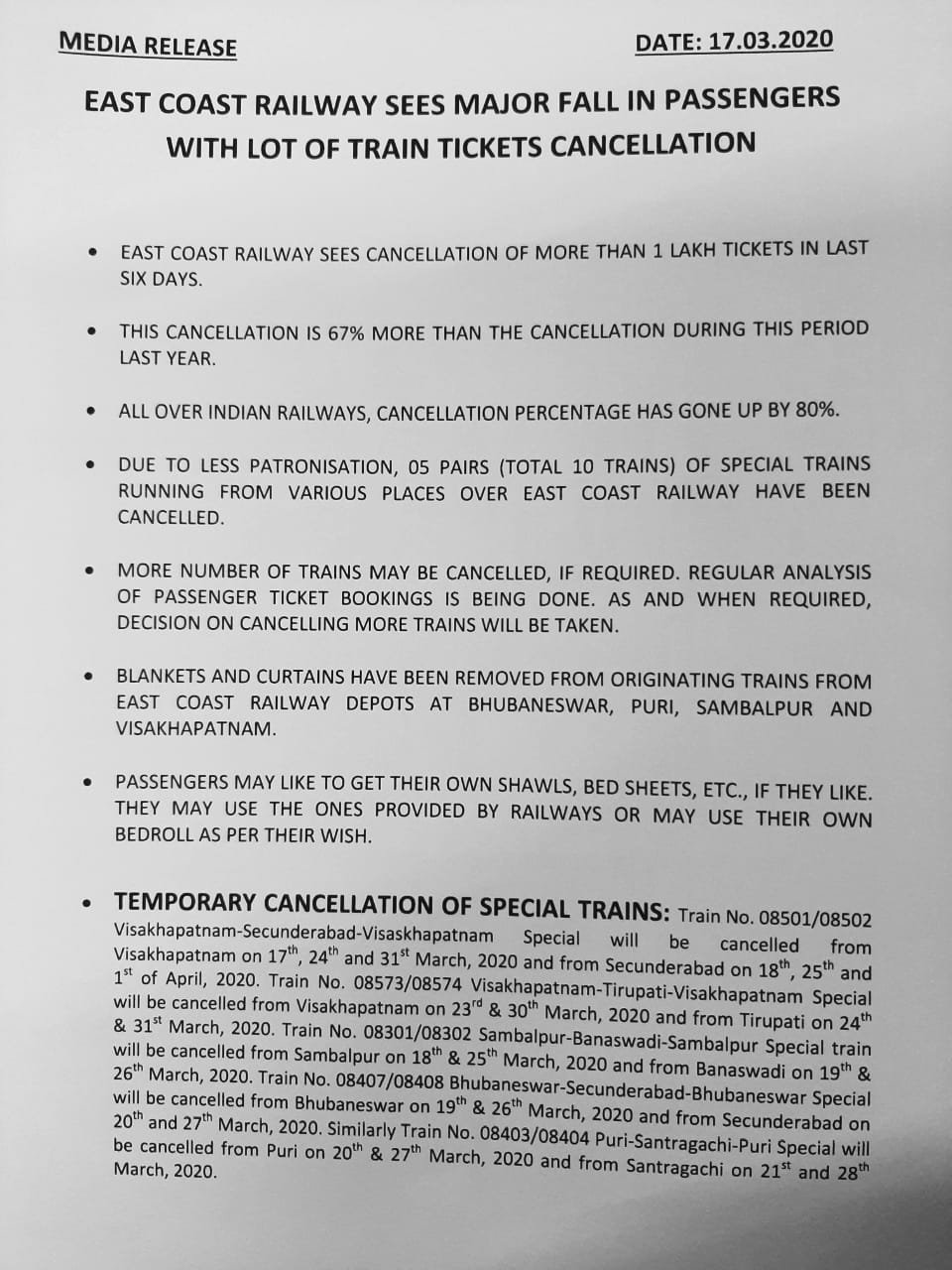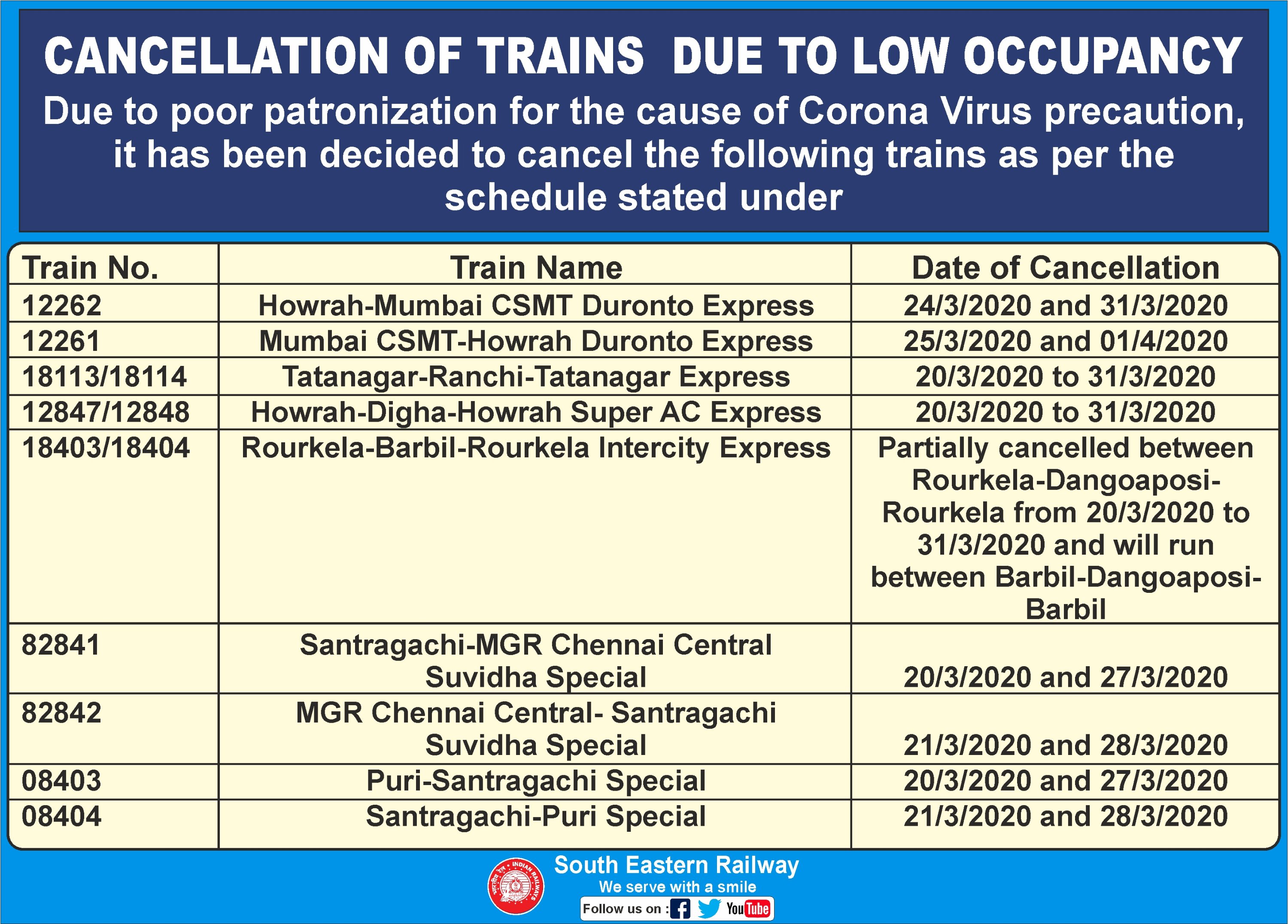 दक्षिण पूर्व रेलवे, पूर्व तटीय रेलवे की रद्द गाड़ियाँ –