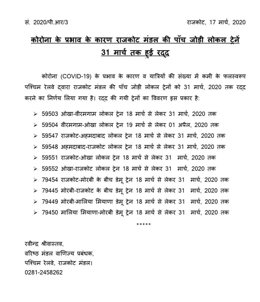 राजकोट डिवीजन की सवारी गाड़ियाँ रद्द-