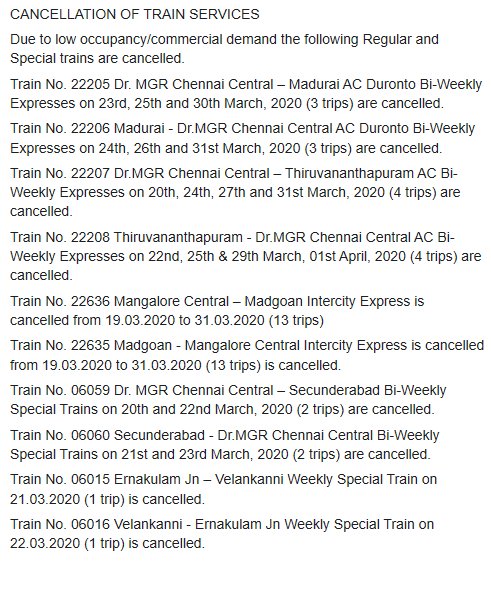 दक्षिण रेलवे की रद्द गाड़ियाँ –