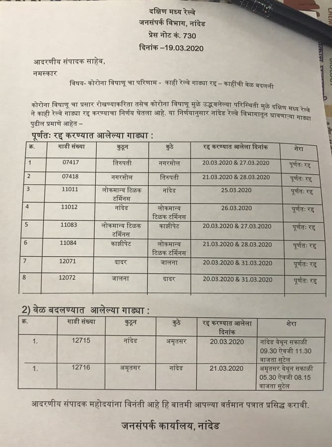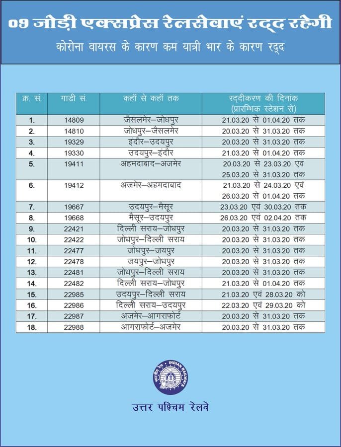 Uncategorisedउत्तर पश्चिम रेलवे और दक्षिण पश्चिम रेलवे की रद्द गाड़ियाँ 19th Mar 202019th Mar 2020 Rail Duniya दक्षिण मध्य रेल के नान्देड डिवीजन में गाड़ियाँ रद्द व समय परिवर्तन Share this: Share on WhatsApp (Opens in new window) WhatsApp Share on X (Opens in new window) X Share on Facebook (Opens in new window) Facebook Share on Telegram (Opens in new window) Telegram Email a link to a friend (Opens in new window) Email Like Loading... Related Published by Rail Duniya Rail Duniya is a magazine publishing all India train timings since 1988. View all posts by Rail Duniya