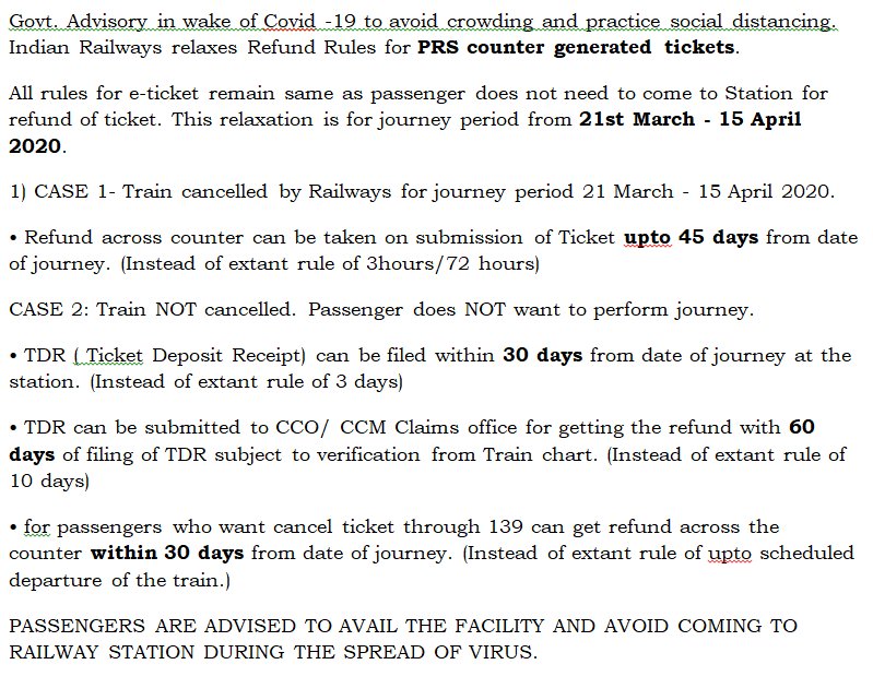 Govt. Advisory in wake of Covid -19 to avoid crowding and practice social distancing. Indian Railways relaxes Refund Rules for PRS counter generated tickets.