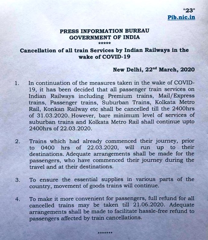 दिनांक 31 मार्च के रात 12 बजे तक सभी रेल गाड़िया जिसमे सारी मेल एक्सप्रेस, सवारी गाड़ियाँ, सारी प्रिमियम गाड़ियाँ जैसे सुपरफास्ट, तेजस, दुरन्तो आदी, तत्काल रद्द की जा रही है।