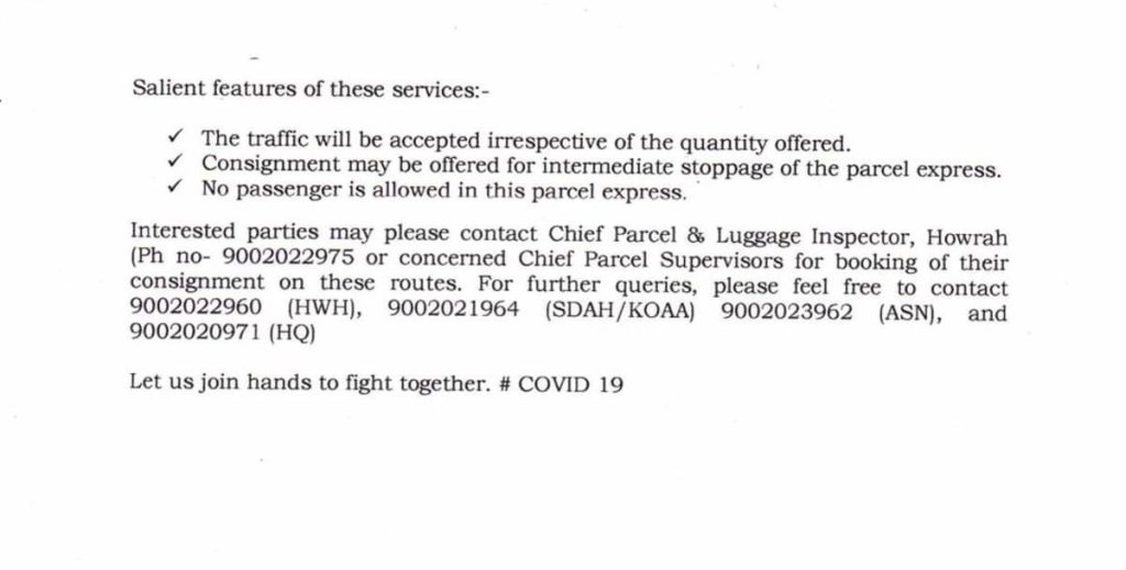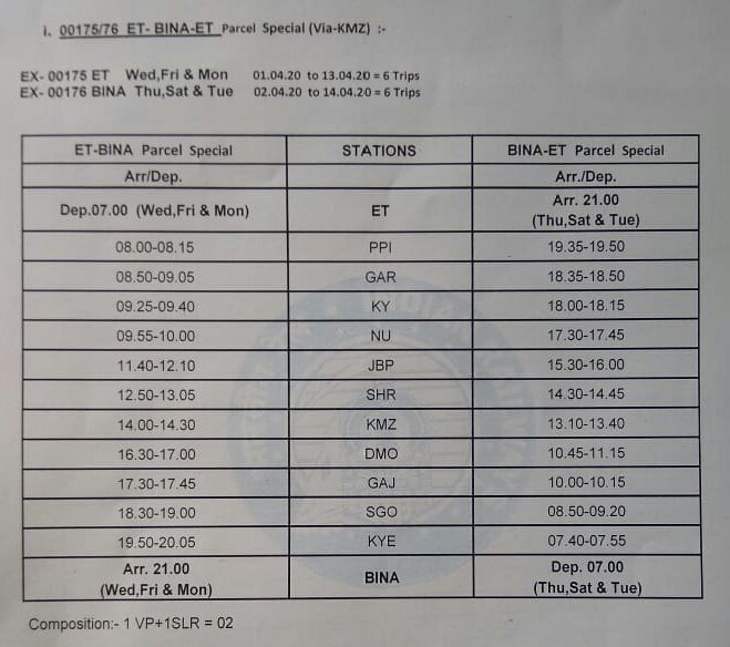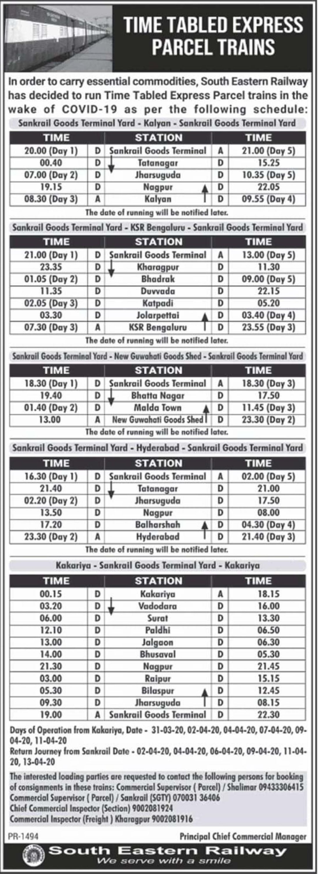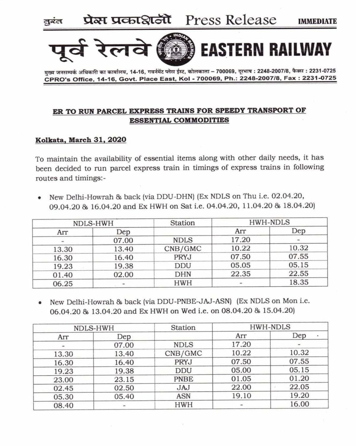सलाम है रेल कर्मियोंको। कहते है न, युद्ध हमेशा सीमाओंपर ही नही होता। आपात स्थितियोंके चलते, कोरोना संक्रमण रोकने के युद्ध मे जो लॉक डाउन है उसमें देश की जनता को रोजमर्रा की चिजोंकी कोई कमी न आए इसलिए रेल प्रशासन पार्सल गाड़ियाँ चला रही है। पूरे देश भर में यह गाड़ियाँ निम्नलिखित मार्गोंपर चलाई जाएगी।