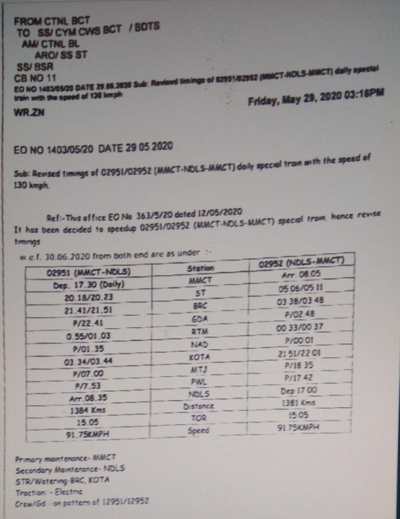 02951 / 02952 मुम्बई नई दिल्ली मुम्बई राजधानी स्पेशल ट्रेन की गति, स्पीड में सुधारणा कर दिनांक 30 जून से यह गाड़ी अपनी अधिकतम गती 130 kmph से दौड़ लगाने वाली है।