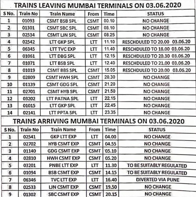 दिनांक 03 जून की छूटने वाली गाड़ियाँ :- 01093 मुम्बई वाराणसी महानगरी, 01301 मुम्बई बेंगालुरु उद्यान, 02534 मुम्बई लखनऊ पुष्पक , 02809 मुम्बई हावड़ा मेल, 01139 मुम्बई गदग स्पेशल, 02701 मुम्बई हैदराबाद हुसैनसागर, 03202 लोकमान्य तिलक टर्मिनस पटना, 01015 लोकमान्य तिलक टर्मिनस गोरखपुर कुशीनगर, 02141 लोकमान्य तिलक टर्मिनस पाटलिपुत्र इन गाड़ियोंका कोई समय परिवर्तन नही किया गया है।