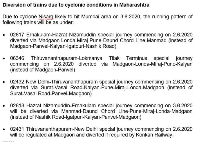 • 02617 Ernakulam-Hazrat Nizamuddin special journey commencing on 2.6.2020 diverted via Madgaon-Londa-Miraj-Pune-Daund Chord Line-Manmad (instead of Madgaon-Panvel-Kalyan-Igatpuri-Nashik Road)