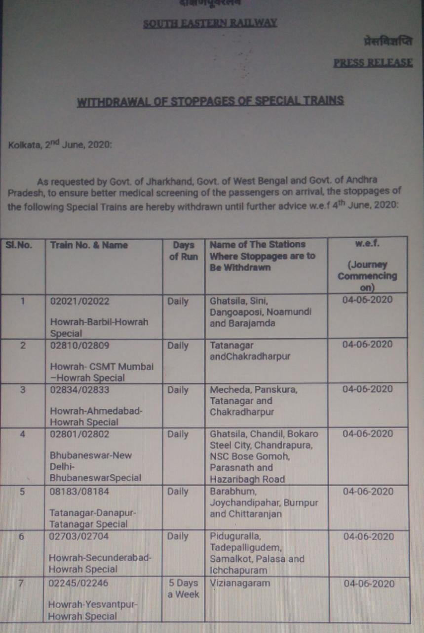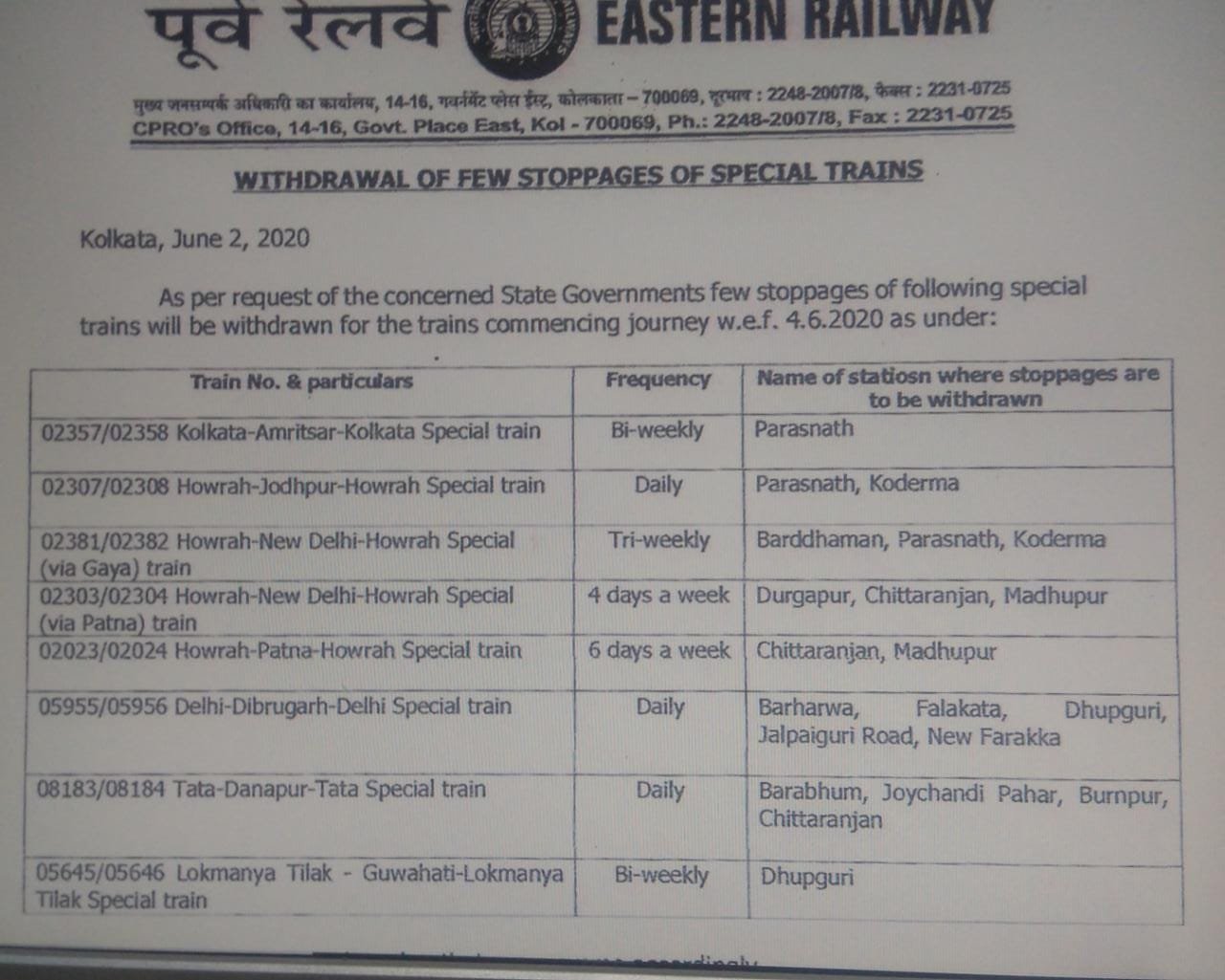 हमारे पास पूर्व रेलवे, दक्षिण पूर्व रेलवे वगैरे के नोटिफिकेशन है, और भी कई राज्योंने स्टापेजेस रद्द करने की सूचना रेलवे को दी है। कृपया यात्री अपनी गाडीका लेटेस्ट, ताजा शेड्यूल ऑनलाईन देख कर ही यात्रा करें।