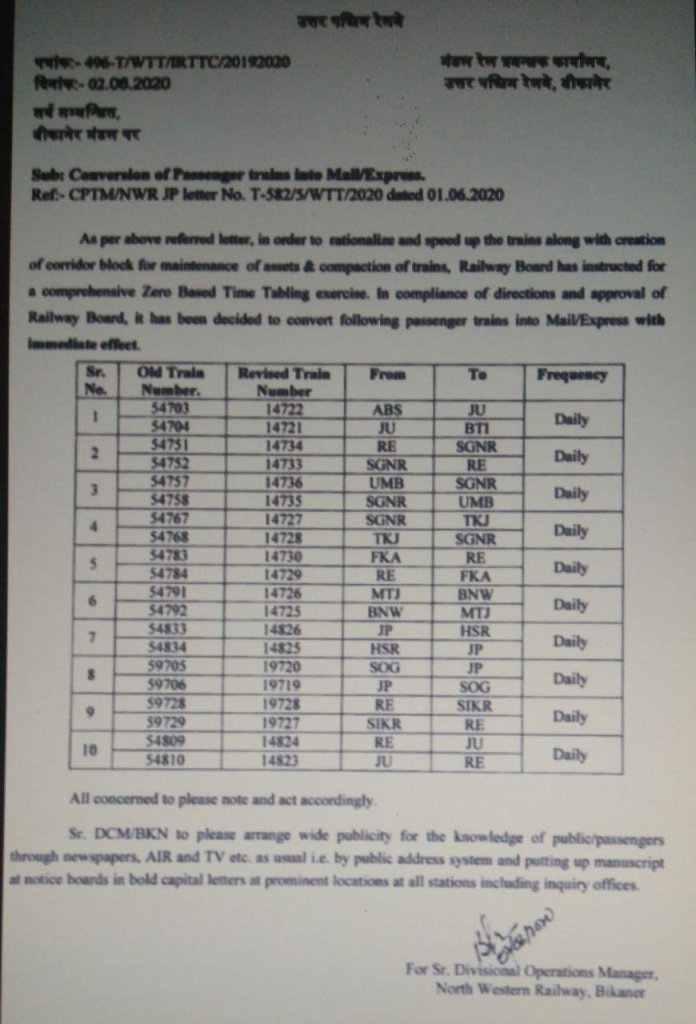 यात्रीगण कृपया ध्यान दे, उत्तर पश्चिम रेलवे की कई सारी गाड़ियाँ जो अब तक सवारी याने पैसेंजर गाड़ियाँ थी उन्हें एक्सप्रेस गाड़ियोंमे तब्दिल किया गया है।