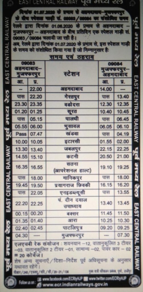 09083 / 09084 अहमदाबाद मुजफ्फरपुर अहमदाबाद डेली स्पेशल एक्सप्रेस दिनांक 1 जून से शुरू हो गयी है। इस गाड़ी का मार्ग अहमदाबाद, वडोदरा, सूरत, भुसावल, इटारसी, जबलपुर, कटनी, प्रयागराज छिवक़ी, पण्डित दीनदयाल उपाध्याय जं, बक्सर, आरा, पाटलिपुत्र, मुजफ्फरपुर इस तरह है।