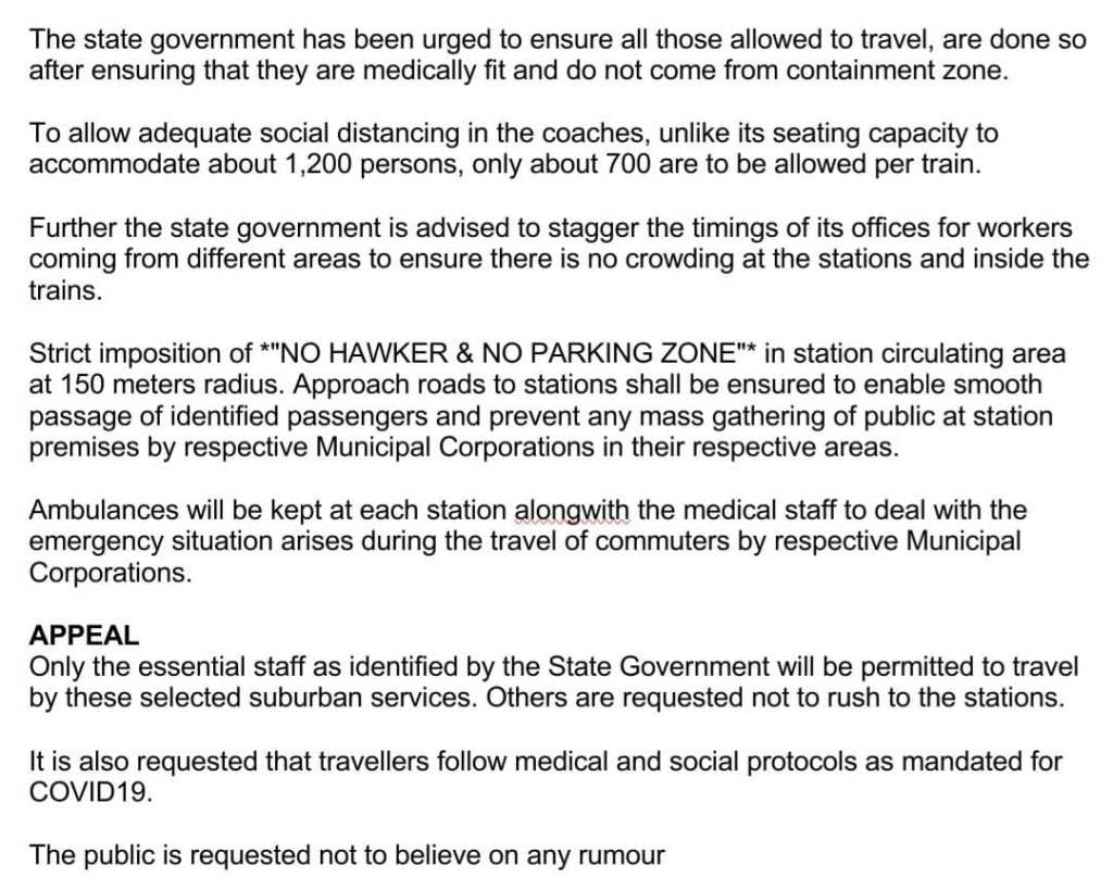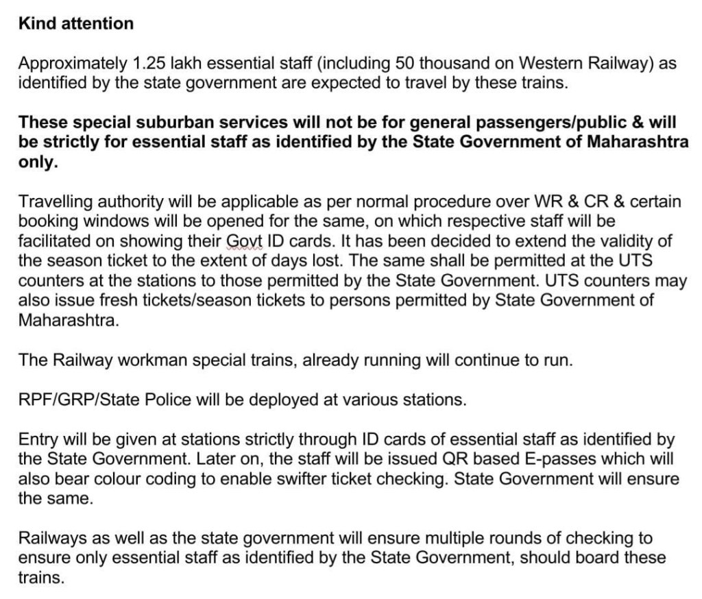 मध्य रेलवे और पश्चिम रेलवे ने मेन लाइन और हार्बर लाइनोंपर सीमित रूपसे लोकल गाड़ियाँ शुरू की है। और विशेष सूचना भी दी है की उपरोक्त लोकल गाड़ियाँ केवल राज्य सरकार द्वारा नामित कर्मियोंके लिए ही वैलिड रहेगी। कृपया अन्य यात्री इन गाड़ियोंमे यात्रा करने का आग्रह न करें। इस तरह का सूचना पत्र रेलवे ने जारी किया है, जो यहाँपर जोड़ रहे है।
