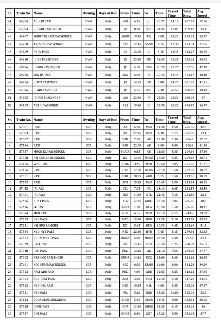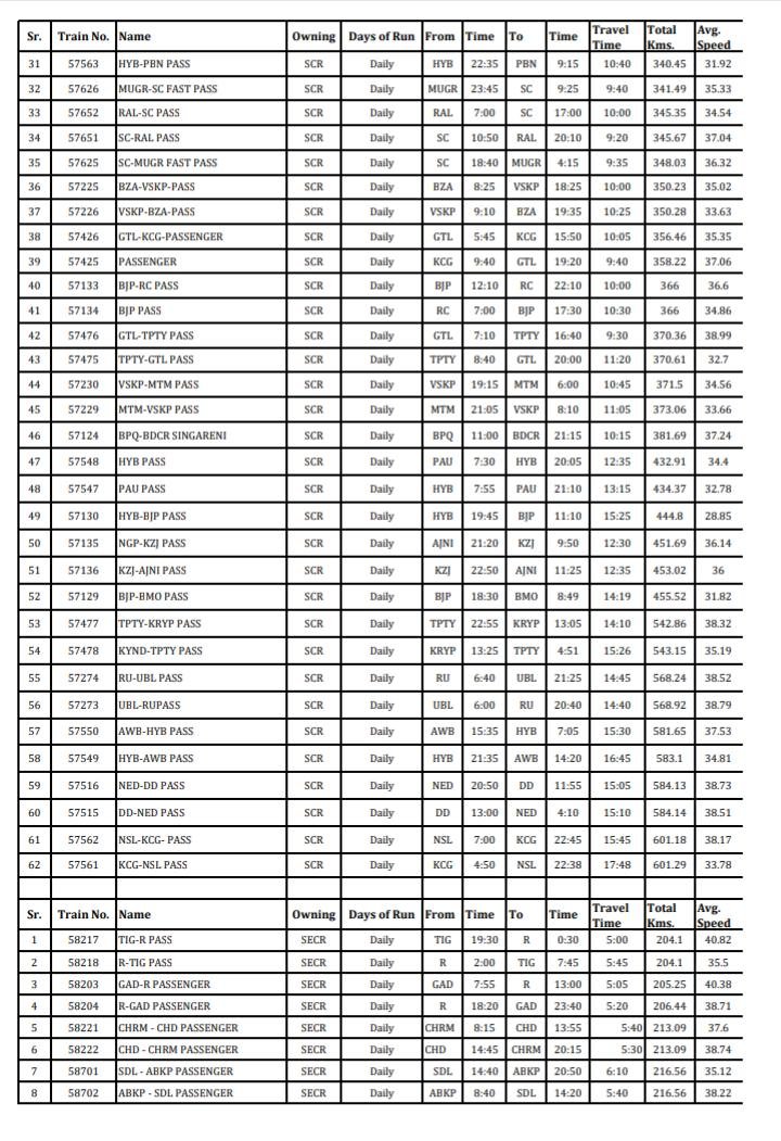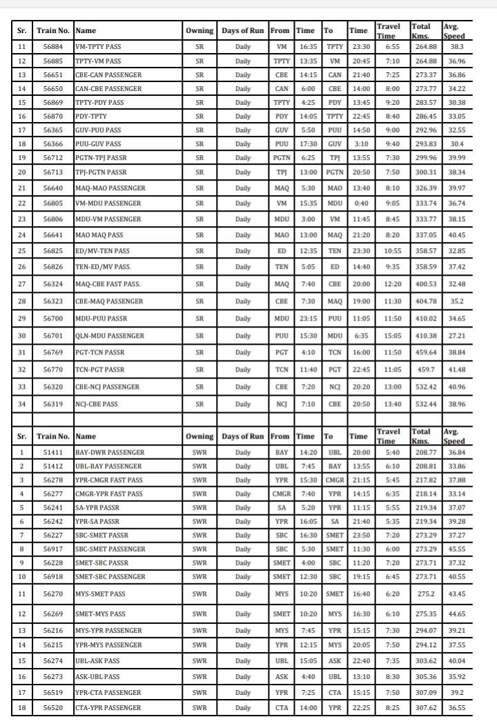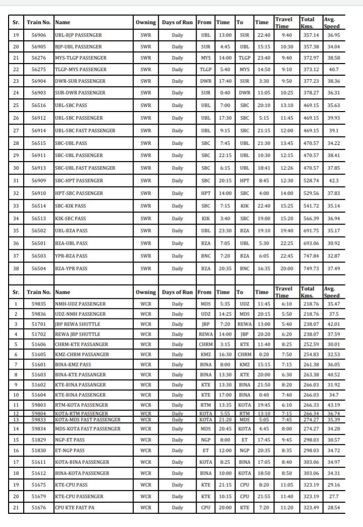 मध्य रेल की 33, पूर्व तटीय रेलवे की 20, पूर्व मध्य रेलवे की 12, पूर्व रेलवे की 30, कोंकण रेलवे की 6, उत्तर मध्य रेलवे की 28, उत्तर पूर्व रेलवे की 16, पूर्वोत्तर सीमान्त रेलवे की 20, उत्तर रेलवे की 49, उत्तर पश्चिम रेलवे की 52, दक्षिण मध्य रेलवे की 62, दक्षिण पूर्व मध्य रेलवे की 18, दक्षिण पूर्व रेलवे की 20, दक्षिण रेलवे की 34, दक्षिण पश्चिम रेलवे की 38, पश्चिम मध्य रेलवे की 32, और पश्चिम रेलवे की 38 गाड़ियाँ नामित की गई है। यह कुल 508 सवारी गाड़ियाँ है।