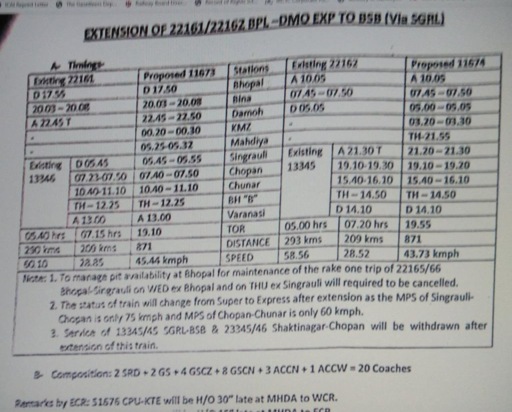 12: 22161/22162 भोपाल दमोह भोपाल राज्यरानी का दमोह से आगे, सिंगरौली होकर वाराणसी तक विस्तार। यह बड़ा लम्बा और महत्वपूर्ण विस्तार है। यह गाड़ी विस्तारित रूप में शुरू होते ही 13345/46 सिंगरौली वाराणसी एक्सप्रेस और 23345/46 शक्तिनगर चोपन लिंक एक्सप्रेस की सेवांए बन्द कर दी जाएगी।