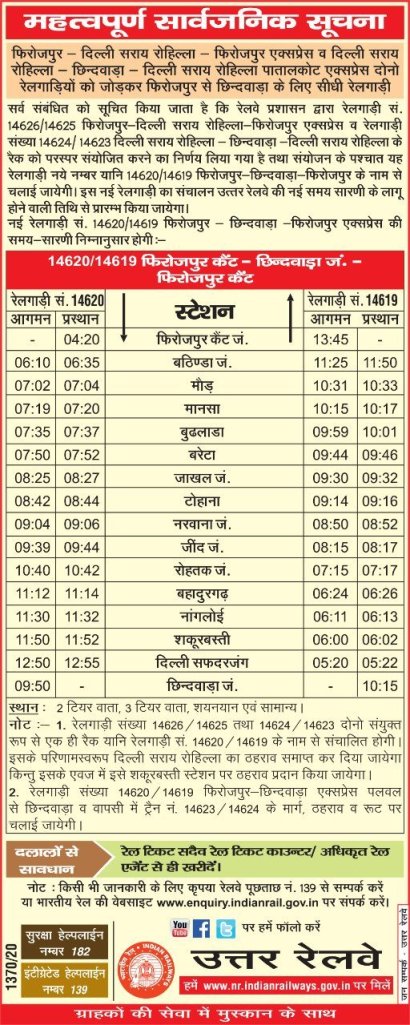 13 : 14625/26 फिरोजपुर दिल्ली सराय रोहिल्ला फिरोजपुर और 14623/24 दिल्ली सराय रोहिल्ला छिन्दवाड़ा दिल्ली सराय रोहिल्ला पातालकोट एक्सप्रेस का मरजिंग कर के एक गाड़ी नए नम्बर 14619/14620 फिरोजपुर से छिन्दवाड़ा के बीच चलाई जाएगी।